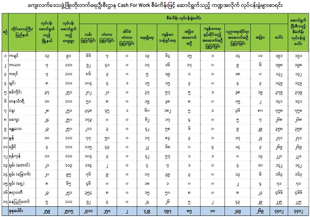 ကိုဗစ်-၁၉ ရောဂါ ဖြစ်ပွားစဉ်ကာလအတွင်း ကျေးလက်နေပြည်သူများ၏ မိသားစုဝင်ငွေရရှိရေး လုပ်ငန်းများထိခိုက်မှုဖြစ်ပေါ်ထိခိုက်မှုများကို ကုစားနိုင်ရန်အတွက် နိုင်ငံတော်အစိုးရမှ Covid-19 Economic Relief Plan(CERP) ကို ရေးဆွဲထုတ်ပြန်ခဲ့ပြီး အဆိုပါစီမံချက်အရ ကျေးလက်ဒေသဖွံ့ဖြိုးတိုးတက်ရေးဦးစီးဌာနက Cash for Work (ဝင်ငွေရရှိရေးအလုပ်အကိုင်ဖန်တီးပေး) စီမံကိန်းကို ဇူလိုင်လမှ စက်တင် ဘာလအထိ သုံးလတာကာလအတွင်း မြို့နယ် ၂၅၉ မြို့နယ်ရှိ ကျေးရွာပေါင်း ၂၅၀၅ ရွာတွင် အကောင် အထည်ဖော်ဆောင်ရွက်ခဲ့ရာ ယခုအခါ ရာနှုန်းပြည့်ဆောင်ရွက်ပြီးစီးနေပြီဖြစ်ကြောင်း သိရသည်။