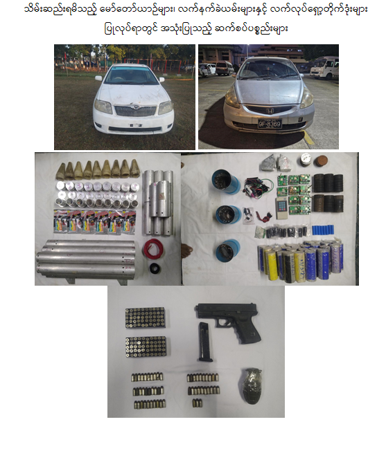 ရန်ကုန်တိုင်းဒေသကြီးရှိ မြို့နယ်များအတွင်း မိုင်းထောင်ဖောက်ခွဲမှုများနှင့် အုပ်ချုပ်ရေးပိုင်းဆိုင်ရာ တာဝန်ရှိသူများအား လုပ်ကြံပစ်ခတ်သူ အကြမ်းဖက်သမား တရားခံအမျိုးသား ၇ ဦးနှင့် အမျိုးသမီး ၁ ဦးတို့အား ကျူးလွန်ရာတွင် အသုံးပြုသည့် လက်နက်၊ ခဲယမ်း၊ ဆက်စပ်ပစ္စည်းများနှင့်အတူ ဖမ်းဆီးရမိ