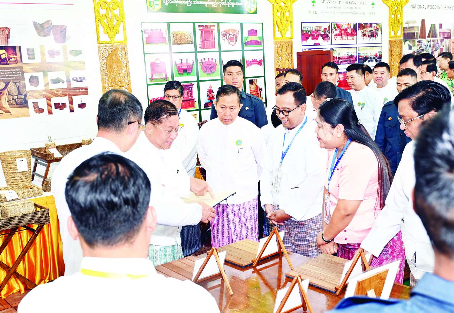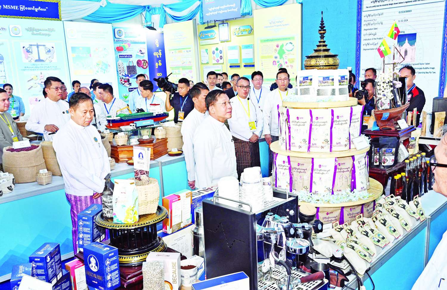 ဖွင့်ပွဲအခမ်းအနားအပြီးတွင် နိုင်ငံတော်စီမံအုပ်ချုပ်ရေးကောင်စီဥက္ကဋ္ဌ နိုင်ငံတော်ဝန်ကြီးချုပ်သည် အဖွဲ့ဝင်များနှင့်အတူ စက်မှုဝန်ကြီးဌာနပြခန်း၊ စိုက်ပျိုးရေး၊ မွေးမြူရေးနှင့်ဆည်မြောင်းဝန်ကြီးဌာနပြခန်း၊ သမဝါယမနှင့်ကျေးလက်ဖွံ့ဖြိုးရေးဝန်ကြီး ဌာနပြခန်း၊ သယံဇာတနှင့်သဘာဝပတ်ဝန်းကျင်ထိန်းသိမ်းရေးဝန်ကြီးဌာနပြခန်း၊ စီးပွားရေးနှင့်ကူးသန်းရောင်းဝယ်ရေးဝန်ကြီးဌာနပြခန်း၊ သိပ္ပံနှင့်နည်းပညာဝန်ကြီးဌာနပြခန်း၊ ကျန်းမာရေးဝန်ကြီးဌာနပြခန်း၊ ပြည်ထောင်စုနယ်မြေ နေပြည်တော် MSME ထုတ်ကုန်ပြခန်း၊ ကချင်ပြည်နယ် MSME ထုတ်ကုန်ပြခန်း၊ ကယားပြည်နယ် MSME ထုတ်ကုန်ပြခန်း၊ ကရင်ပြည်နယ် MSME ထုတ်ကုန်ပြခန်း၊ ချင်းပြည်နယ် MSME ထုတ်ကုန်ပြခန်း၊ စစ်ကိုင်းတိုင်းဒေသကြီး MSME ထုတ်ကုန်ပြခန်း၊ တနင်္သာရီတိုင်းဒေသကြီး MSME ထုတ်ကုန်ပြခန်း၊ ပဲခူးတိုင်းဒေသကြီး MSME ထုတ်ကုန်ပြခန်း၊ မကွေးတိုင်းဒေသကြီး MSME ထုတ်ကုန်ပြခန်း၊ မွန်ပြည်နယ် MSME ထုတ်ကုန်ပြခန်း၊ ရခိုင်ပြည်နယ် MSME ထုတ်ကုန်ပြခန်း၊ ရန်ကုန်တိုင်းဒေသကြီး MSME ထုတ်ကုန်ပြခန်း၊ ရှမ်းပြည်နယ် MSME ထုတ်ကုန်ပြခန်း၊ ဧရာဝတီတိုင်းဒေသကြီး MSME ထုတ်ကုန်ပြခန်းတို့အား ပြခန်းတစ်ခုချင်းစီအလိုက် စိတ်ပါဝင်စားစွာဖြင့် လိုက်လံကြည့်ရှုပြီး ထုတ်ကုန်များအလိုက် လုပ်ငန်းဆောင်ရွက်မှုများ၊ ကုန်ကြမ်းရရှိမှုနှင့် သုံးစွဲမှု၊ ထုတ်ကုန်များထုတ်လုပ်မှု၊ ပြည်တွင်း၊ ပြည်ပ ဈေးကွက်ရရှိမှုအခြေအနေများ၊ လုပ်ငန်းလိုအပ်ချက်များနှင့် ပြည်တွင်း၊ ပြည်ပသို့ ပိုမိုတိုးချဲ့ဖြန့်ဖြူးနိုင်မည့်အခြေအနေများနှင့် သိရှိလိုသည်များမေးမြန်းဆွေးနွေးပြီး လိုအပ်သည်များကို တာဝန်ရှိသူများနှင့် ပေါင်းစပ်ညှိနှိုင်းဖြည့်ဆည်းဆောင်ရွက်ပေးကာ ကြည့်ရှုမှုများကို ခေတ္တရပ်နားသည်။