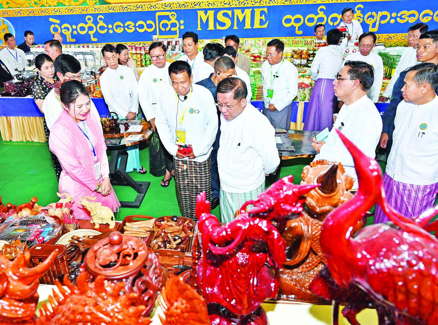 ဦးစွာ အသေးစား၊ အငယ်စားနှင့် အလတ်စား စီးပွားရေးလုပ်ငန်းများ ဖွံ့ဖြိုးတိုးတက်ရေးလုပ်ငန်းကော်မတီဥက္ကဋ္ဌ နိုင်ငံတော်စီမံအုပ်ချုပ်ရေးကောင်စီ ဒုတိယဥက္ကဋ္ဌ ဒုတိယဝန်ကြီးချုပ် ဒုတိယဗိုလ်ချုပ်မှူးကြီး စိုးဝင်း၊ ပြည်ထောင်စုဝန်ကြီးများဖြစ်ကြသည့် ဦးဝင်းရှိန်၊ ဦးမင်းနောင်၊ ဦးလှမိုး၊ ဒေါက်တာ ချာလီသန်း၊ ဒေါက်တာ မျိုးသိန်းကျော်တို့နှင့် နေပြည်တော်ကောင်စီဥက္ကဋ္ဌ ဦးသန်းထွန်းဦးတို့က ပြည်ထောင်စုအဆင့် MSME ထုတ်ကုန်ပြပွဲနှင့်ပြိုင်ပွဲ ဖွင့်ပွဲအခမ်းအနားကို ဖဲကြိုးဖြတ်ဖွင့်လှစ်ပေးကြသည်။