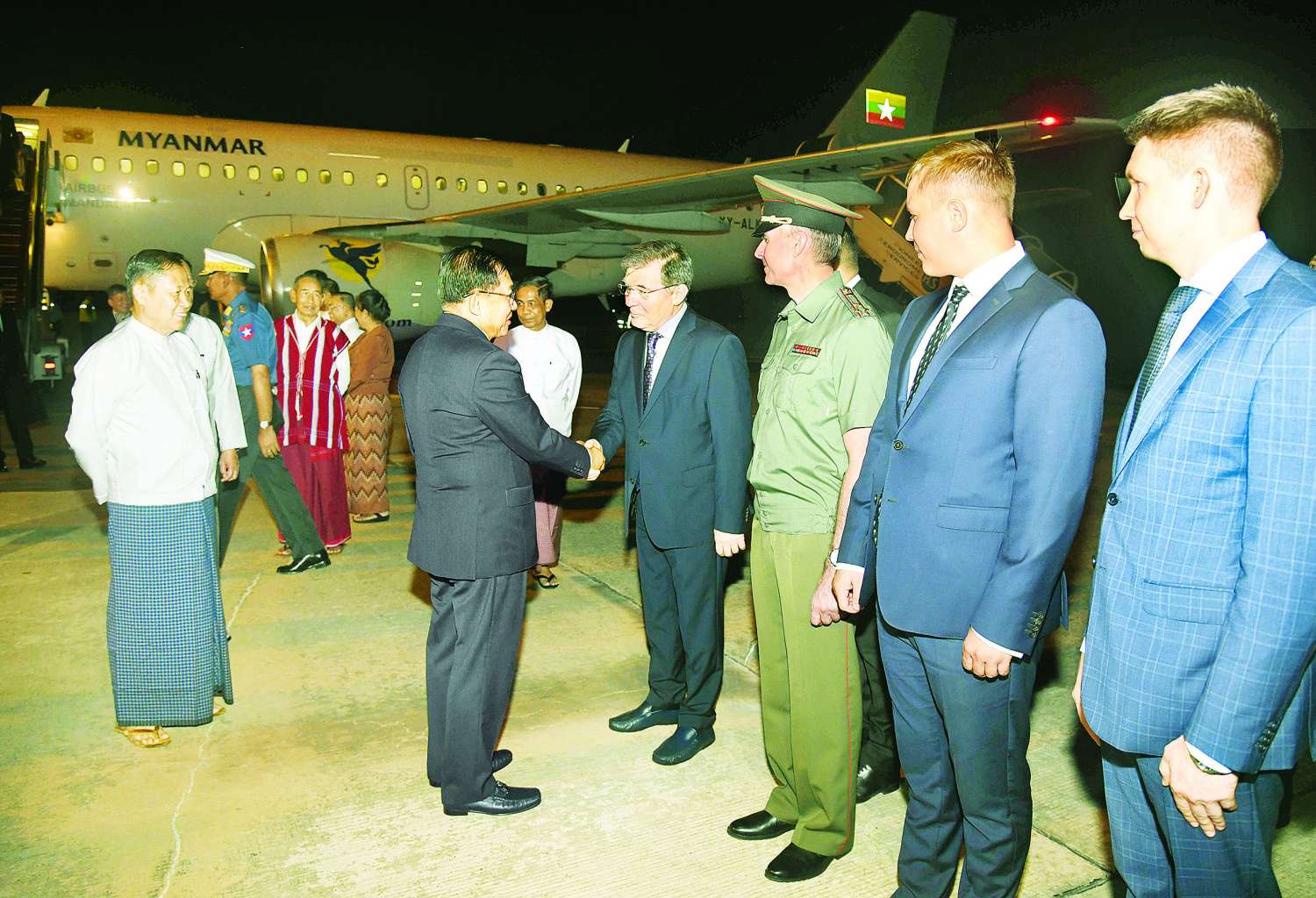ရုရှားဖက်ဒရေးရှင်းနိုင်ငံတွင် ကျင်းပပြုလုပ်ခဲ့သော ၁၉၄၁-၁၉၄၅ မဟာမျိုးချစ်စစ်ပွဲကြီးအောင်ပွဲ နှစ် (၈၀) ပြည့်အထိမ်းအမှတ် စစ်ရေးပြအခမ်းအနားသို့တက်ရောက်ခဲ့သည့် နိုင်ငံတော်စီမံအုပ်ချုပ်ရေးကောင်စီဥက္ကဋ္ဌ နိုင်ငံတော်ဝန်ကြီးချုပ် ဗိုလ်ချုပ်မှူးကြီး မင်းအောင်လှိုင် ဦးဆောင်သည့် မြန်မာအဆင့်မြင့် ကိုယ်စားလှယ်အဖွဲ့ဝင်များသည် ယနေ့နံနက်ပိုင်းတွင် ရုရှားဖက်ဒရေးရှင်းနိုင်ငံ မော်စကိုမြို့ရှိ ဘနူကာဘာ အပြည်ပြည်ဆိုင်ရာလေဆိပ်မှ ပြည်ထောင်စုသမ္မတမြန်မာနိုင်ငံတော်သို့ အထူးလေယာဉ်ဖြင့် ပြန်လည်ထွက်ခွာရာ ရုရှားဖက်ဒရေးရှင်းနိုင်ငံ နိုင်ငံခြားရေးဝန်ကြီးဌာန အစိုးရပရိုတိုကောဌာန၏ ညွှန်ကြားရေးမှူးနှင့် တာဝန်ရှိသူများ၊ ရုရှားဖက်ဒရေးရှင်းနိုင်ငံဆိုင်ရာ မြန်မာနိုင်ငံ သံအမတ်ကြီး ဦးသစ်လင်းအုန်း၊ မြန်မာစစ်သံ (ကြည်း၊ ရေ၊ လေ) ဗိုလ်မှူးချုပ် ကျော်စိုးဦးနှင့် တာဝန်ရှိသူများက လေဆိပ်တွင် လိုက်လံပို့ဆောင်နှုတ်ဆက်ကြသည်။