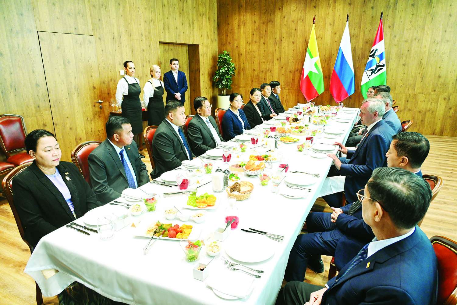 ယင်းနောက် နိုင်ငံတော်စီမံအုပ်ချုပ်ရေးကောင်စီဥက္ကဋ္ဌ နိုင်ငံတော်ဝန်ကြီးချုပ်နှင့် နိုဗာစီဗစ်ဒေသအုပ်ချုပ်ရေးမှူးတို့သည် လေဆိပ်ဧည့်ခန်းမဆောင်၌ တွေ့ဆုံဆွေးနွေးရာတွင် ၁၉၄၁-၁၉၄၅ မဟာမျိုးချစ်စစ်ပွဲကြီးအောင်ပွဲ နှစ် (၈၀) ပြည့် အထိမ်းအမှတ် အခမ်းအနားနှင့် ဆက်စပ်အခမ်းအနားများသို့ မြန်မာနိုင်ငံမှ နိုင်ငံတော်စီမံအုပ်ချုပ်ရေးကောင်စီဥက္ကဋ္ဌ နိုင်ငံတော်ဝန်ကြီးချုပ်ကိုယ်တိုင် တက်ရောက်ခဲ့သည့်အတွက် နိုဗာစီဗစ်ဒေသအုပ်ချုပ်ရေးမှူးအနေဖြင့် ဝမ်းမြောက်ဂုဏ်ယူရသည့်အခြေအနေများ၊ မြန်မာနိုင်ငံတွင် မန္တလေးငလျင်ကြီးဖြစ်ပေါ်ခဲ့မှု၊ ထိခိုက်ဆုံးရှုံးခဲ့ရမှုများကို နိုင်ငံတော်အစိုးရနှင့် ပြည်သူတို့လက်တွဲ၍ ပြန်လည်ထူထောင်ရေးနှင့် ပြန်လည်တည်ဆောက်ရေးလုပ်ငန်းများကို အကောင်းဆုံးဆောင်ရွက်လျက်ရှိမှုအခြေအနေများ၊ မြန်မာနိုင်ငံနှင့် နိုဗာစီဗစ်ဒေသတို့အကြား ပူးပေါင်းဆောင်ရွက်မှုများ တိုးတက်ကောင်းမွန်လျက်ရှိမှုနှင့် ထိတွေ့ဆက်ဆံမှုနှင့် ပူးပေါင်းဆောင်ရွက်မှုများ တိုးမြှင့်ဆောင်ရွက်နိုင်ရေးအတွက် ဆက်လက်ဆောင်ရွက်သွားနိုင်မည့် အခြေအနေများနှင့်ပတ်သက်၍ ရင်းနှီးပွင့်လင်းစွာ အမြင်ချင်းဖလှယ်ဆွေးနွေးခဲ့ကြသည်။