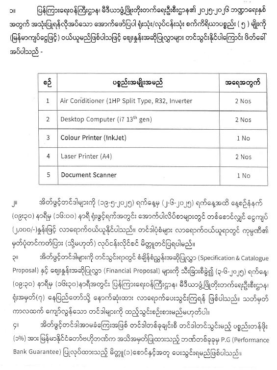 ရုံးသုံး/လုပ်ငန်းသုံးစက်ကိရိယာများ ဝယ်ယူရန်အတွက် အိတ်ဖွင့်တင်ဒါခေါ်ယူခြင်း
