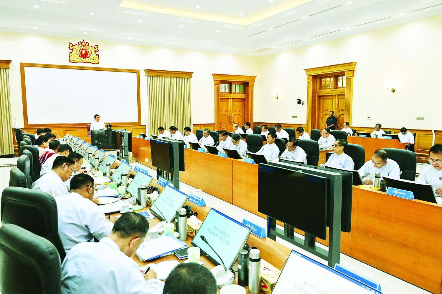 ယင်းနောက် နိုင်ငံတော်စီမံအုပ်ချုပ်ရေးကောင်စီ ဒုတိယဥက္ကဋ္ဌ ဒုတိယဝန်ကြီးချုပ်က ဆွေးနွေးပြောကြားရာတွင် ပါတီစုံဒီမိုကရေစီအထွေထွေ ရွေးကောက်ပွဲတစ်ရပ်ကို ယခုနှစ်လကုန်ပိုင်းတွင် ကျင်းပပြုလုပ်သွားမည်ဖြစ်သဖြင့် တိုင်းဒေသကြီးနှင့် ပြည်နယ်ဝန်ကြီးချုပ်များအနေဖြင့် ရွေးကောက်ပွဲအောင်မြင်မှုရှိစေရေး လိုအပ်သည်များ ကြိုတင်ပြင်ဆင်ဆောင်ရွက်ထားရှိရန်လိုကြောင်း၊ တိုင်းဒေသကြီးနှင့် ပြည်နယ်များအလိုက် ရွေးကောက်ပွဲဆိုင်ရာ အချက်အလက်များကို ပြည့်စုံစွာဖြင့် ဆောင်ရွက်သွားရန်လိုကြောင်း၊ လွတ်လပ်ပြီးတရားမျှတသည့် ရွေးကောက်ပွဲအောင်မြင်စွာ ကျင်းပနိုင်ရေးအတွက် လုံခြုံရေးနှင့်တည်ငြိမ်အေးချမ်းရေးသည် အဓိကကျခြင်းကြောင့် ရွေးကောက်ပွဲဆောင်ရွက်၍ ရနိုင်သည့် နေရာများအားလုံး၌ တည်ငြိမ်အေးချမ်းမှုရှိအောင် ဆောင်ရွက်သွားရန်လိုကြောင်း။