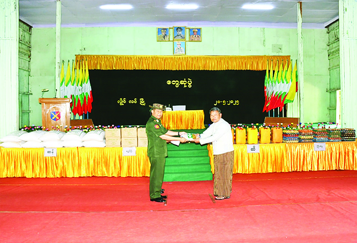 ဦးစွာ တိုင်းမှူးက အဖွင့်အမှာစကားပြောကြားပြီး စစ်မှုထမ်းဟောင်းအဖွဲ့ဝင်များ၏ တင်ပြချက်များအပေါ် လိုအပ်သည်များ ပေါင်းစပ်ညှိနှိုင်းဆောင်ရွက်ပေးသည်။ ထို့နောက် တိုင်းမှူးက စစ်မှုထမ်းဟောင်းအဖွဲ့ဝင်များအတွက် ဆန်၊ ဆီ၊ ဆား၊ ပဲနှင့် အာဟာရ ဖြည့်စားသောက်ဖွယ်ရာများ ပေးအပ်ပြီး စစ်မှုထမ်းဟောင်းအဖွဲ့ဝင်များအား ရင်းရင်းနှီးနှီးလိုက်လံနှုတ်ဆက်သည်။