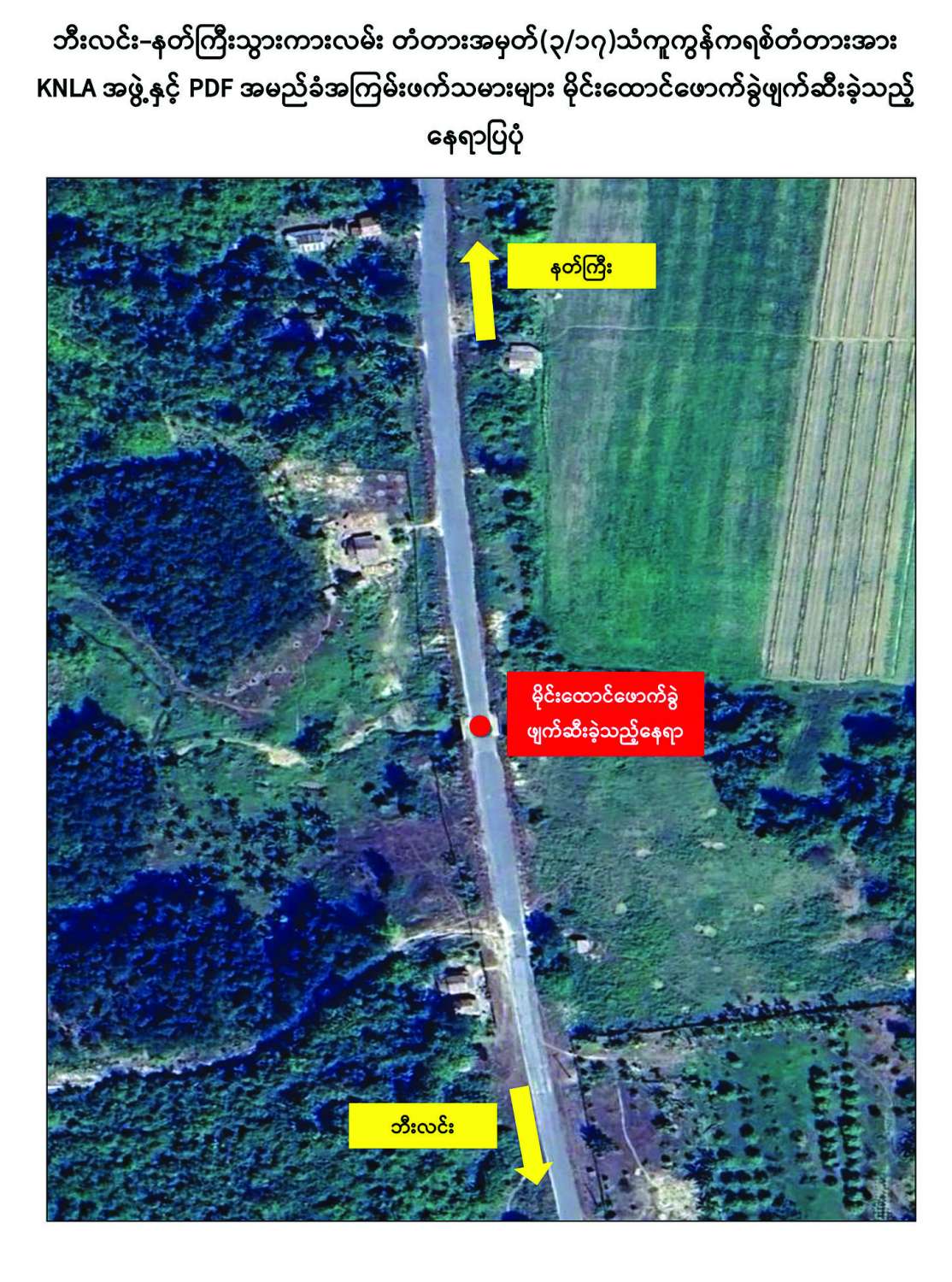 ထိုသို့ လုပ်ဆောင်လျက်ရှိရာ KNLA အဖွဲ့နှင့် PDF အမည်ခံ အကြမ်းဖက်သမားများက ယနေ့နံနက်ပိုင်းတွင် မွန်ပြည်နယ် ဘီးလင်းမြို့နယ် တညင်ပင်ကျေးရွာ ၏ အနောက်ဘက် မီတာ ၃၀၀ ခန့်အကွာ ဘီးလင်း-နတ်ကြီးသွား ကားလမ်းမကြီးပေါ်ရှိ မိုင်တိုင်အမှတ်၊ ၁၆/၂ နှင့် ၃ အကြား အရှည် ပေ ၈၀၊ အကျယ် ၂၄ ပေရှိ သံကူကွန်ကရစ်အမျိုးအစား တံတားအမှတ်(၃/၁၇)အား မိုင်းထောင်ဖောက်ခွဲဖျက်ဆီးခဲ့ကြသည်။ မိုင်းပေါက်ကွဲမှုဒဏ်ကြောင့် အဆိုပါသံကူကွန်ကရစ်တံတားမှာ တောင်ဘက်ကမ်းကပ်ခုံမှ ပြိုကျပျက်စီးခဲ့ပြီး လူနှင့်မော်တော်ယာဉ်များ ဖြတ်သန်းသွားလာနိုင်မှုမရှိကြောင်းနှင့် ပျက်စီးသွားသည့်တံတားအား တာဝန်ရှိသူများက ပြန်လည်ပြုပြင်ခြင်းလုပ်ငန်းများကို အမြန်ဆုံးဆောင်ရွက်လျက်ရှိကြောင်း သိရသည်။