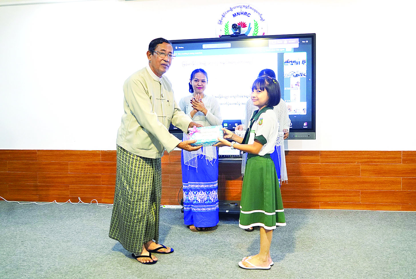 မြန်မာနိုင်ငံ အမျိုးသားလူ့အခွင့်အရေးကော်မရှင်ရုံးဝန်ထမ်းများ၏ အခြေခံပညာကျောင်းနေအရွယ် သားသမီးများ ဒုတိယအကြိမ် ပညာသင်စရိတ်ထောက်ပံ့ပေးအပ်သည့် အခမ်းအနားကို ယနေ့မွန်းလွဲပိုင်းတွင် ကော်မရှင်ရုံး၌ ပြုလုပ်ရာ ကော်မရှင်ဥက္ကဋ္ဌ၊ ကော်မရှင်အဖွဲ့ဝင်များ၊ ကော်မရှင်ရုံးဝန်ထမ်းများနှင့် ဝန်ထမ်းများ၏ အခြေခံပညာကျောင်းနေအရွယ်သားသမီးများ တက်ရောက်ကြသည်။