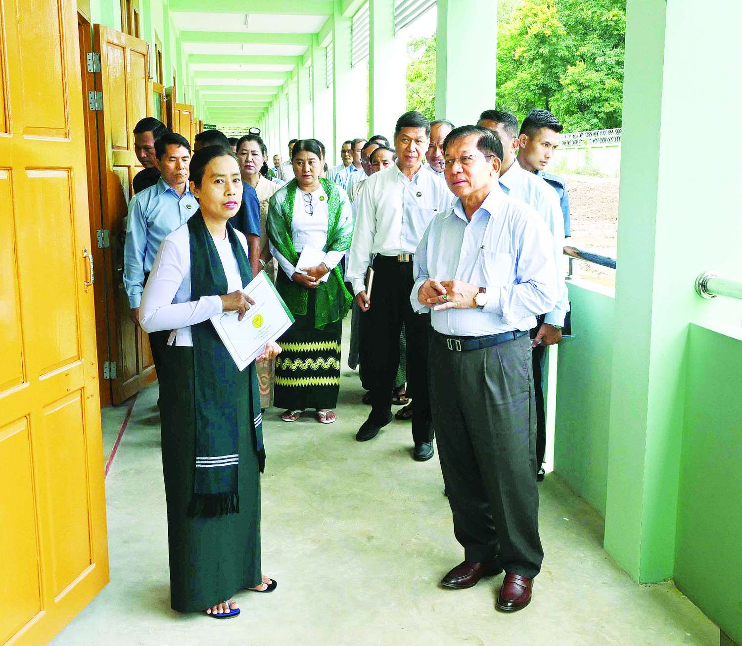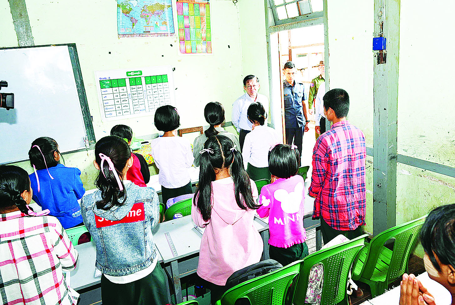 ထို့နောက် နိုင်ငံတော်စီမံအုပ်ချုပ်ရေးကောင်စီဥက္ကဋ္ဌ နိုင်ငံတော်ဝန်ကြီးချုပ်နှင့် အဖွဲ့ဝင်များသည် အခြေခံပညာအထက်တန်းကျောင်း (ခွဲ) အမှတ် (၁) အခြေခံပညာအလယ်တန်းကျောင်းသို့ ရောက်ရှိကြရာ ဆရာ၊ ဆရာမများက ကြိုဆိုနှုတ်ဆက်ကြသည်။ ယင်းနောက် နိုင်ငံတော်စီမံအုပ်ချုပ်ရေးကောင်စီဥက္ကဋ္ဌ နိုင်ငံတော်ဝန်ကြီးချုပ်သည် စာသင်ခန်းများအတွင်း ကျောင်းသား၊ ကျောင်းသူများ၏ ပညာသင်ကြားနေမှုများ၊ မွေးမြူရေးအတတ်ပညာ၊ စိုက်ပျိုးရေးအတတ်ပညာနှင့် စက်မှုနည်းပညာ စာသင်ခန်းမများအတွင်း သင်ကြားပို့ချနေမှုများကို လိုက်လံကြည့်ရှုအားပေးသည်။