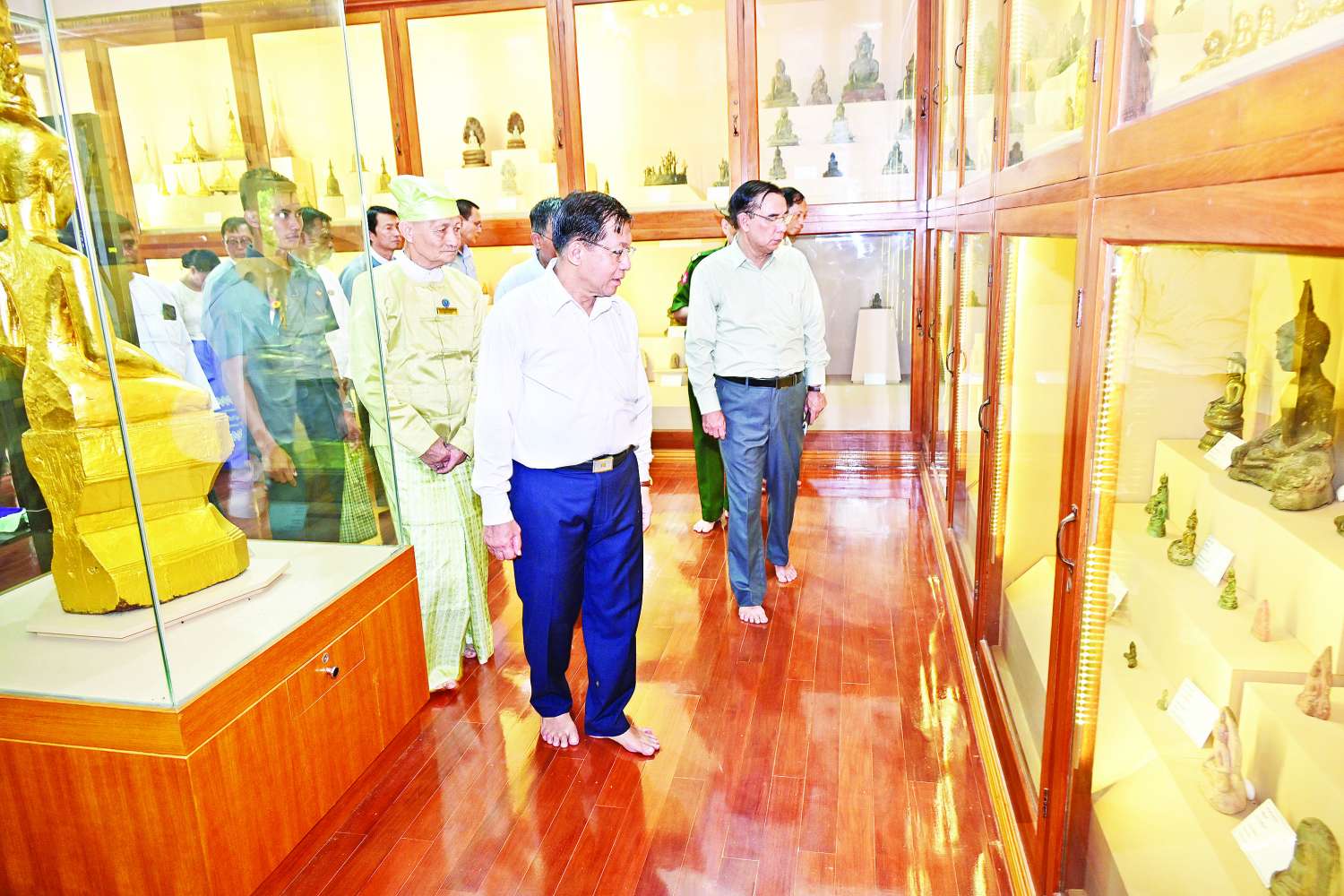 ဆက်လက်၍ ရွှေမော်ဓောစေတီတော် သမိုင်းပြတိုက်အတွင်း ခင်းကျင်းပြသထားသည့် ရှေးဟောင်းလက်ရာ ဗုဒ္ဓရုပ်ပွားတော်များ၊ လက်ဝတ်ရတနာများ၊ အသုံးအဆောင်ပစ္စည်းများကိုကြည့်ရှုပြီး စနစ်တကျ ထိန်းသိမ်းကြရန်နှင့် အခြားလိုအပ်သည်များကို မှာကြားသည်။