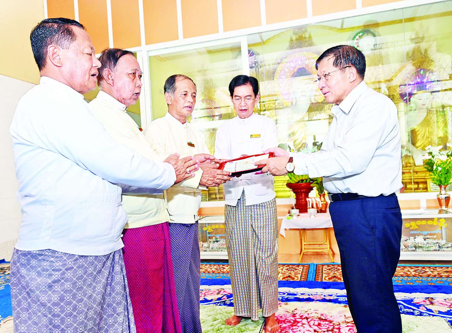 ထို့နောက် နိုင်ငံတော်လုံခြုံရေးနှင့်အေးချမ်းသာယာရေးကော်မရှင်ဥက္ကဋ္ဌက စေတီတော်မြတ်ကြီးအတွက် ဘက်စုံအလှူငွေများကို ပေးအပ်လှူဒါန်းရာ တာဝန်ရှိသူများက လက်ခံရယူပြီး ဓမ္မလက်ဆောင်များ ပြန်လည်ပေးအပ်သည်။