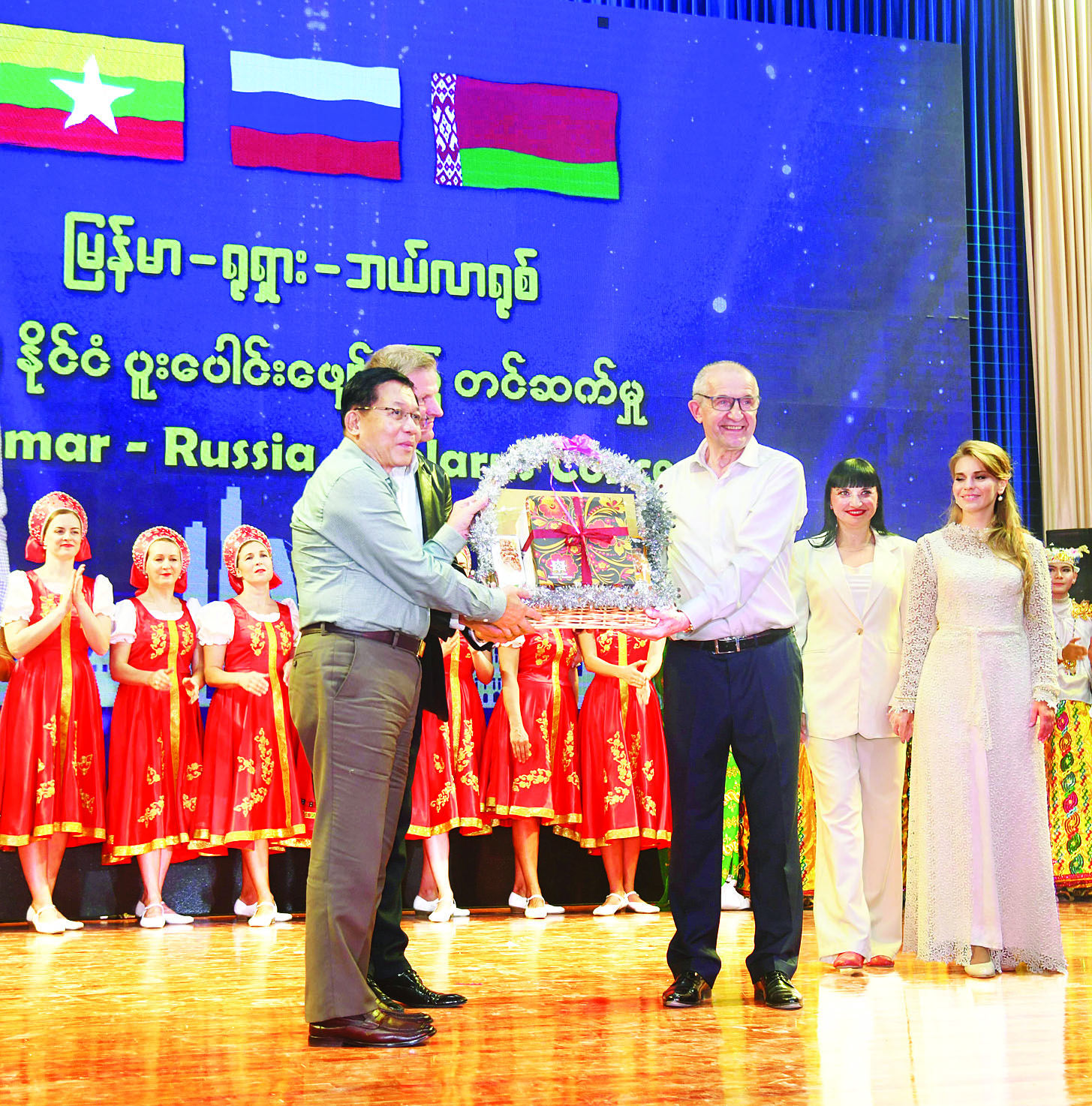 ယင်းနောက် ရုရှား-မြန်မာ ချစ်ကြည်ရေးအသင်းဒုတိယဥက္ကဋ္ဌနှင့် ဘယ်လာရုစ်တေးဂီတ အဖွဲ့ခေါင်းဆောင်တို့က နိုင်ငံတော်ယာယီသမ္မတနိုင်ငံတော်လုံခြုံရေးနှင့် အေးချမ်းသာယာရေး ကော်မရှင်ဥက္ကဋ္ဌထံဂုဏ်ပြုလက်ဆောင်ပေးအပ်သည်။