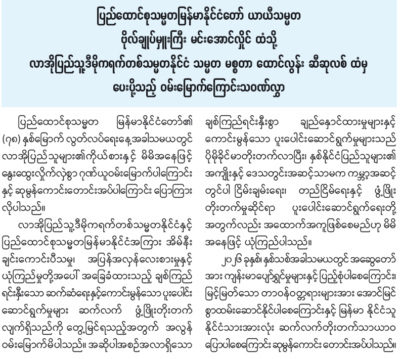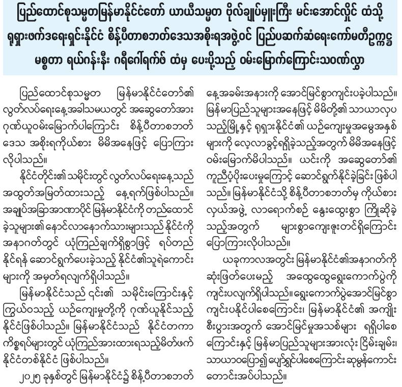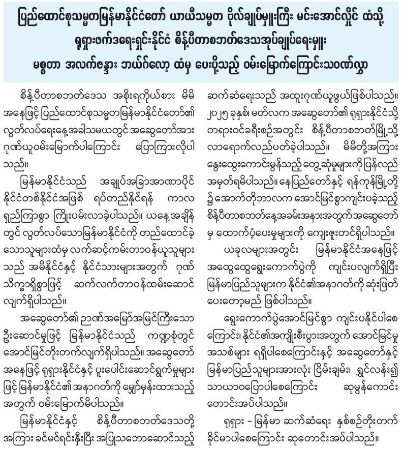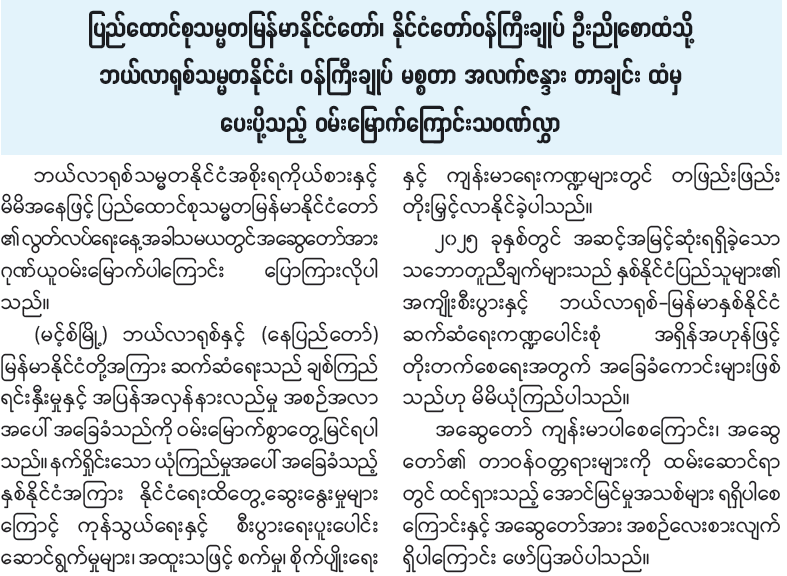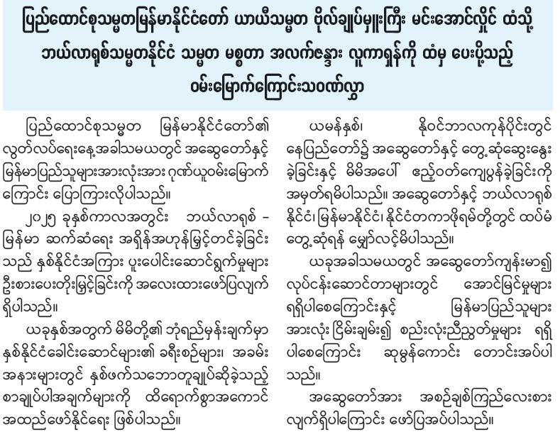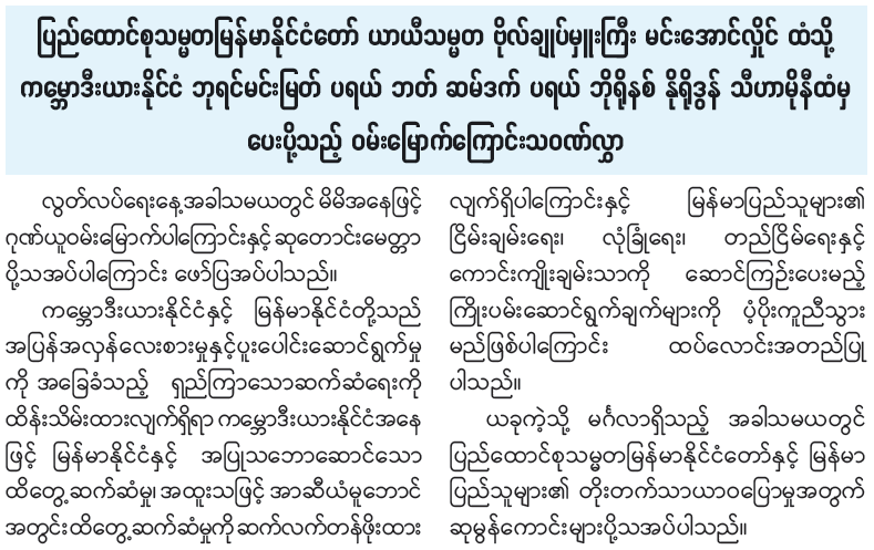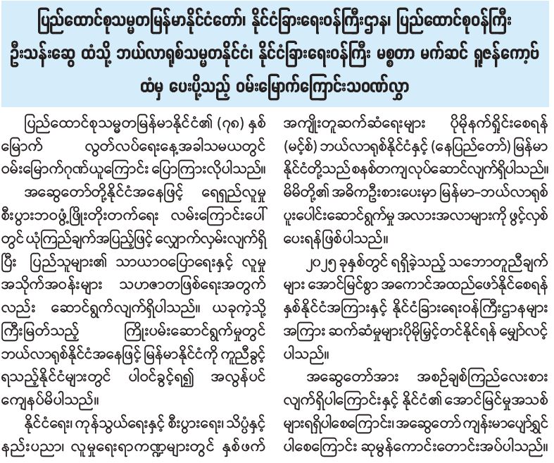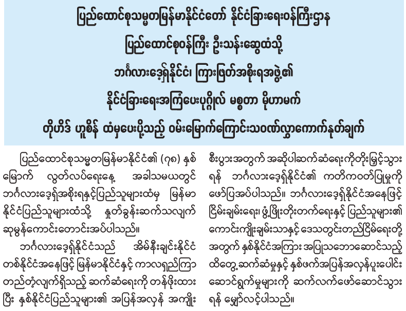 ၂၀၂၆ ခုနှစ် ဇန်နဝါရီလ ၄ ရက်နေ့တွင်ကျရောက်သည့် ပြည်ထောင်စုသမ္မတမြန်မာနိုင်ငံတော်၏ (၇၈)နှစ်မြောက် လွတ်လပ်ရေးနေ့အခါသမယအတွက် ပြည်ပနိုင်ငံအသီးသီးမှ နိုင်ငံအကြီးအကဲများက ပြည်ထောင်စုသမ္မတမြန်မာနိုင်ငံတော် ယာယီသမ္မတ ဗိုလ်ချုပ်မှူးကြီး မင်းအောင်လှိုင်၊ နိုင်ငံတော်ဝန်ကြီးချုပ် ဦးညိုစောနှင့် နိုင်ငံခြားရေးဝန်ကြီးဌာန ပြည်ထောင်စုဝန်ကြီး ဦးသန်းဆွေတို့ထံ ဝမ်းမြောက်ကြောင်း သဝဏ်လွှာများ အသီးသီးပေးပို့ကြပါသည်။