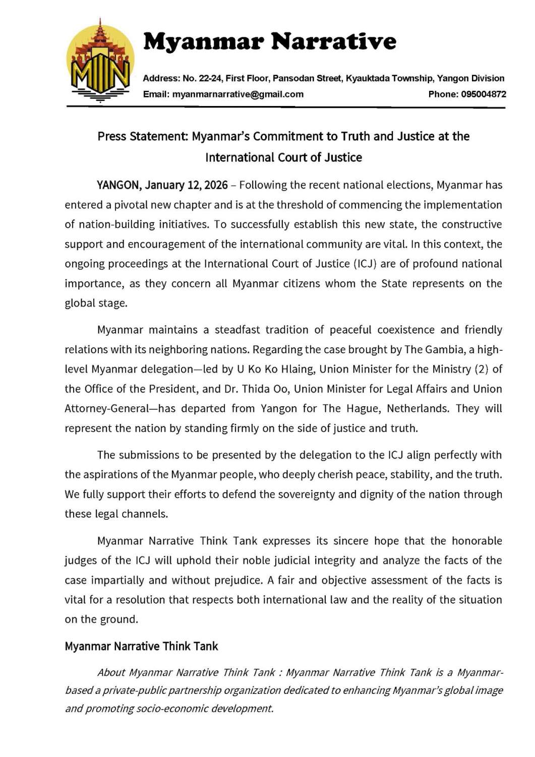 အပြည်ပြည်ဆိုင်ရာတရားရုံးရှိ ဂုဏ်သရေရှိတရားသူကြီးများအနေဖြင့်လည်း မိမိတို့၏ မွန်မြတ်လှသော တရားစီရင်ရေးဆိုင်ရာ ကျင့်ဝတ်သိက္ခာကို ထိန်းသိမ်းလျက်၊ မည်သည့်အစွဲအလမ်းမျှမပါဘဲ အခြေအနေမှန်နှင့် အဖြစ်မှန်များကို ဘက်လိုက်မှုကင်းစွာဖြင့် ဝေဖန်ဆန်းစစ် သုံးသပ်နိုင်လိမ့်မည်ဟု မျှော်လင့်ယုံကြည်ပါသည်။ နိုင်ငံတကာဥပဒေနှင့် မြေပြင်တွင် အမှန်တကယ်ဖြစ်ပျက်နေသည့် အခြေအနေများအပေါ် အပြန်အလှန်လေးစားလိုက်နာမှုရှိသော အဖြေတစ်ခု ထွက်ပေါ်လာရေးအတွက် အဖြစ်မှန်များကို မျှတစွာ သုံးသပ်ဆုံးဖြတ်ရန်မှာ အလွန်ပင်အရေးကြီးကြောင်း မြန်မာ့ပုံရိပ်ဖော်ညွှန်းရေးအဖွဲ့ Myanmar Narrative Think Tank က သတင်းထုတ်ပြန်အပ်ပါသည်။