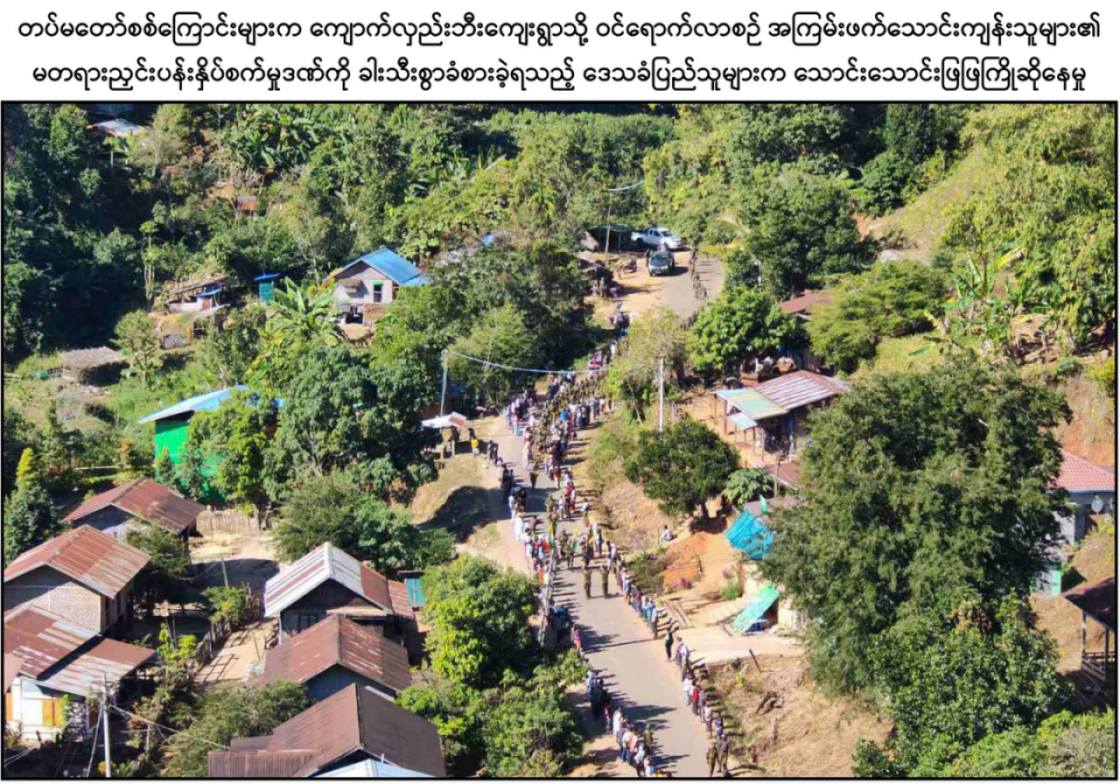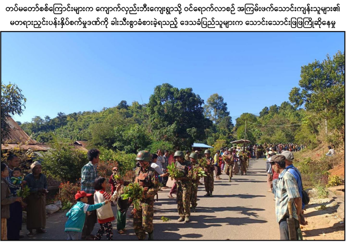 အကြမ်းဖက်သောင်းကျန်းသူများ ယာယီစိုးမိုးထားသည့် ညောင်ပင်သာကျေးရွာ၊ ပိုးဇာနွယ်ကျေးရွာ၊ ကျောက်လှည်းဘီးကျေးရွာတို့ကို တပ်မတော်စစ်ကြောင်းများက ပြန်လည်သိမ်းပိုက်ပြီး နယ်မြေရှင်းလင်းချီတက်စဉ် လမ်းကြောင်းတစ်လျှောက်တွင် အကြမ်းဖက်သောင်းကျန်းသူများ၏ မတရားနှိပ်စက်ညှင်းပန်းမှုဒဏ်ကို ခါးသီးစွာခံစားခဲ့ရသည့် ဒေသခံပြည်သူများသည် သက်ကြီးရွယ်အိုများ၊ ကလေးသူငယ်များပါမကျန် ကျားမ၊ ကြီးငယ်မရွေး အောင်သပြေပန်းများ၊ ပန်းကုံးများကိုင်ဆောင်ကာ တပ်မတော်စစ်ကြောင်းများကို သောင်းသောင်းဖြဖြ ဝမ်းပန်းတသာကြိုဆိုခဲ့ကြသည်ကို ကြည်နူးဝမ်းမြောက်ဖွယ်တွေ့မြင်ခဲ့ရသည်။