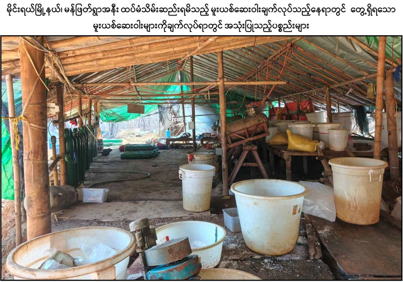 အဆိုပါ သိမ်းဆည်းရမိမှုများနှင့်ဆက်စပ်၍ လုံခြုံရေးပူးပေါင်းအဖွဲ့များက လေကြောင်းကင်းထောက်ခြင်း၊ မြေပြင်သတင်းစုံစမ်းဖော်ထုတ်ခြင်းနှင့် နယ်မြေရှင်းလင်းခြင်းတို့ကို ဆက်လက်ဆောင်ရွက်ခဲ့ရာ ဇန်နဝါရီ ၁၆ ရက် ယနေ့နံနက် ၇ နာရီ ၃၀ မိနစ်ခန့်တွင် ရှမ်းပြည်နယ်(မြောက်ပိုင်း)၊ မိုင်းရယ်မြို့၏ အနောက်တောင်ဘက် ၁၉ ကီလိုမီတာခန့်အကွာ၊ မန်ဖြတ်ကျေးရွာ၏ အနောက်မြောက်ဘက် ၁၅ ကီလိုမီတာခန့်အကွာ၌ မသင်္ကာဖွယ်ရာအဆောက်အအုံများတွေ့ရှိရသဖြင့် သွားရောက်ရှင်းလင်းခဲ့ရာ မူးယစ်ဆေးဝါးချက်လုပ်ရာတွင် အသုံးပြုသည့် အလျား ၂၀ ပေ၊ အနံ ၄၀ ပေရှိအဆောက်အအုံ ၁ လုံး၊ အလျား ၅၀ ပေ၊ အနံ ၂၀ ပေရှိ လူနေတဲ ၁ လုံး၊ မူးယစ်ဆေးဝါးရောစပ်သည့် စတီးဗန်း ၆ ခုပါ အဆောက်အအုံ ၁ လုံး၊ အလျား ၁၂၀ ပေ၊ အနံ ၄၀ ပေရှိ အဆောက်အအုံ ၁ လုံး၊ အခြောက်ခံမွှေစက် ၂ လုံး၊ မူးယစ်ဆေးဝါး အဖြူရောင်အမှုန့်များထားရှိသည့် ဂိုဒေါင် ၁ လုံး၊ အလျား ၁၂၀ ပေ၊ အနံ ၂၀ ပေရှိ လူနေအဆောက်အအုံ ၁ လုံး၊ မီးစက်ကြီး ၅ လုံး၊ Loader ၁ စီး၊ Bulldozer ၁ စီး၊ အပြာရောင် ပေပါအခွံ ၁၀၀ လုံး၊ ပုံးအဖြူရောင် ၅၀ လုံး၊ ဂက်စ်အိုး ၄၀ လုံး၊ စိစစ်ဆဲဓာတုဗေဒပစ္စည်းထည့်ထားသော အိတ် ၅၀ လုံးခန့်တို့အား ထပ်မံတွေ့ရှိသိမ်းဆည်းခဲ့သည်။