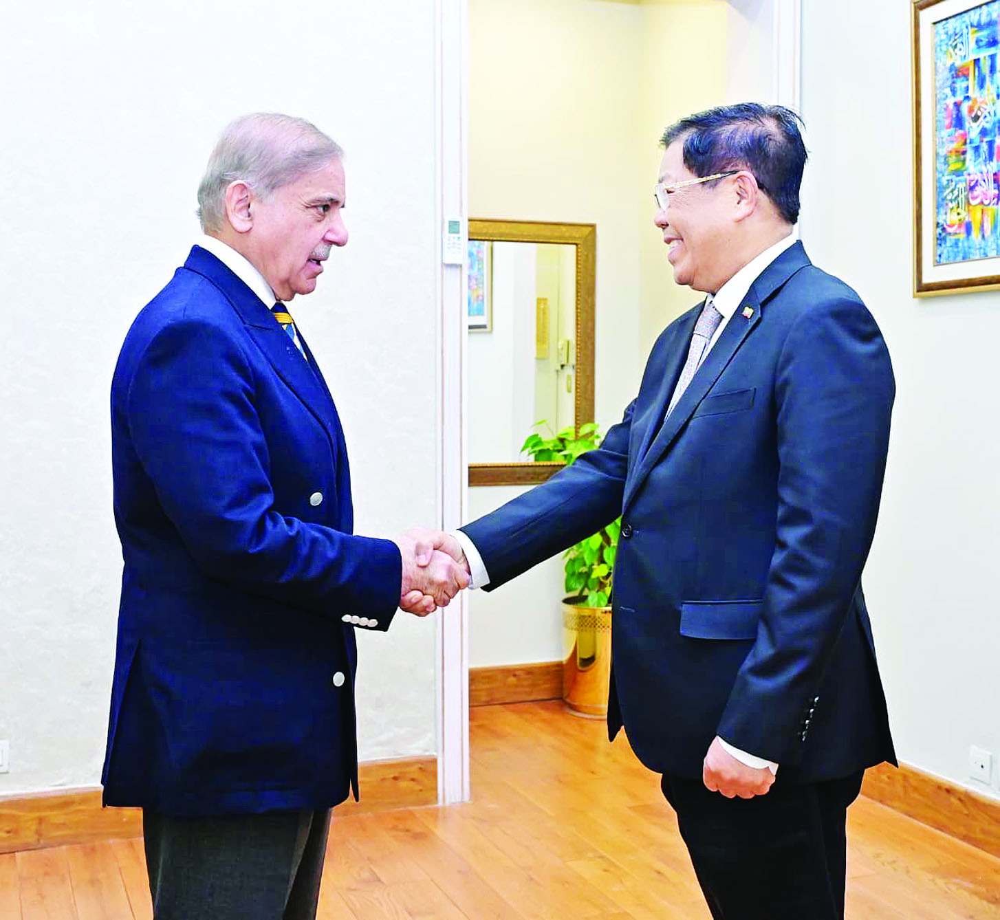 ပါကစ္စတန်နိုင်ငံ ဒုတိယဝန်ကြီးချုပ်နှင့် နိုင်ငံခြားရေးဝန်ကြီး မစ္စတာမိုဟာမက်အီရှပ်ဒါး၏ ဖိတ်ကြားချက်အရ ပါကစ္စတန်နိုင်ငံ၌ တရားဝင်ခရီးစဉ်ရောက်ရှိနေသည့် နိုင်ငံခြားရေးဝန်ကြီးဌာန ပြည်ထောင်စုဝန်ကြီး ဦးသန်းဆွေ ဦးဆောင်သည့် ကိုယ်စားလှယ်အဖွဲ့သည် ယနေ့နံနက် ၁၀ နာရီတွင် ဝန်ကြီးချုပ်ရုံး၌ ပါကစ္စတန်နိုင်ငံဝန်ကြီးချုပ် မစ္စတာမိုဟာမက်ရှီဘက်ရှာရစ်ဖ်အား ဂါရဝပြုတွေ့ဆုံနှုတ်ဆက်သည်။