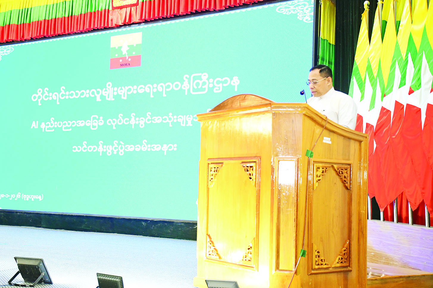 တိုင်းရင်းသားလူမျိုးများရေးရာဝန်ကြီးဌာန AI နည်းပညာ အခြေခံလုပ်ငန်းခွင်အသုံးချမှု သင်တန်းဖွင့်ပွဲကို ယနေ့နံနက်ပိုင်းတွင် တိုင်းရင်းသားလူမျိုးများရေးရာဝန်ကြီးဌာန ပြည်ထောင်စုဝန်ကြီးရုံး အစည်းအဝေးခန်းမ၌ ကျင်းပသည်။