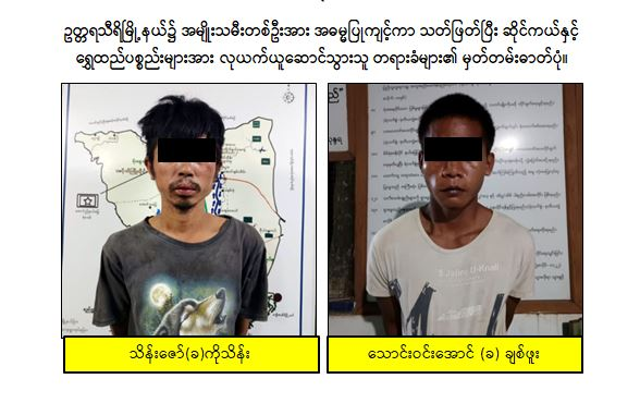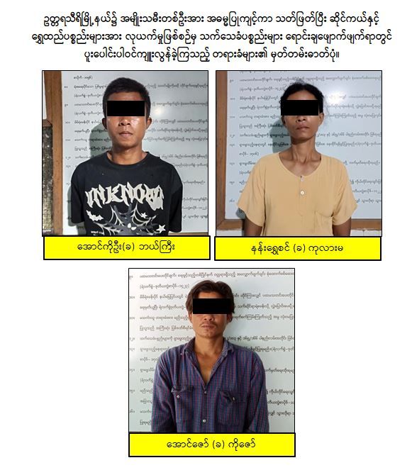 ထို့သို့ဆောင်ရွက်ခဲ့ရာ ပြစ်မှုကျူးလွန်ခဲ့သူများသည် ဇမ္ဗူသီရိမြို့နယ်တွင် ဆောက်လုပ်ရေး လုပ်ငန်းလာရောက်လုပ်ကိုင်သူများဖြစ်ကြောင်း ဖော်ထုတ်သိရှိရသဖြင့် ဖမ်းဆီးရမိနိုင်ရေးဆောင်ရွက်ခဲ့ရာ ကဝမြို့နယ်၊ အင်းမော်ကျေးရွာနေ သိန်းဇော်(ခ)ကိုသိန်း (၄၃)နှစ်၊ ဒဂုံမြို့သစ် (ဆိပ်ကမ်း) မြို့နယ်၊ အမှတ်(၆၇)ရပ်ကွက်နေ သောင်းဝင်းအောင် (ခ) ချစ်ဖူး (၂၃)နှစ်၊ ဒက္ခိဏသီရိမြို့နယ်၊ စိုက်ခင်း(၃)ကျေးရွာနေ အောင်ကိုဦး (ခ) ဘယ်ကြီး (၂၇)နှစ်နှင့် ကဝမြို့နယ်၊ ဝါးတောကျေးရွာနေ နန်းရွှေစင် (ခ) ကုလားမ (၄၁)နှစ်တို့အား ဖြစ်စဉ်တွင် ပျောက်ဆုံးနေသည့် CANDA 110 ဆိုင်ကယ် တစ်စီးနှင့်အတူ စက်တင်ဘာလ ၁ ရက်နေ့ ညပိုင်းတွင် ဇမ္ဗူသီရိမြို့နယ်အတွင်းရှိ ဆောက်လုပ်ရေး လုပ်ငန်းခွင်တစ်ခုမှ ဖမ်းဆီးရမိခဲ့ပြီး ပူးပေါင်းပါဝင်ခဲ့သည့် ဒေးဒရဲမြို့၊ အမှတ်(၂)ရပ်ကွက်နေ အောင်ဇော် (ခ) ကိုဇော် (၄၄)နှစ်အား စက်တင်ဘာလ ၂ ရက်နေ့ညပိုင်းတွင် ဒက္ခိဏသီရိမြို့နယ်၊ စိုက်ခင်း(၃)ကျေးရွာ၌ ထပ်မံဖမ်းဆီးရမိခဲ့ပါသည်။