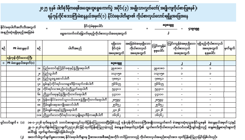 ၂၀၂၅ ခုနှစ် ပါတီစုံဒီမိုကရေစီအထွေထွေရွေးကောက်ပွဲ အပိုင်း(၃) အမျိုးသားလွှတ်တော်(အချိုးကျကိုယ်စားပြုစနစ်)၊ ရန်ကုန်တိုင်းဒေသကြီးမဲဆန္ဒနယ်အမှတ် (၁) နိုင်ငံရေးပါတီများ၏ ကိုယ်စားလှယ်လောင်းရရှိမှုအခြေအနေ 01/30/2026