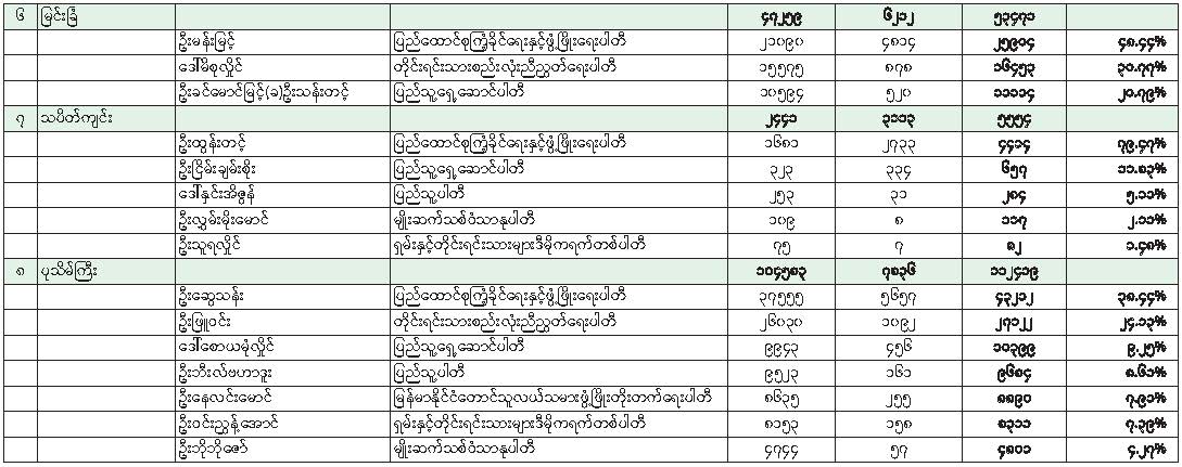 ၂၀၂၅ ခုနှစ် ပါတီစုံဒီမိုကရေစီအထွေထွေရွေးကောက်ပွဲ အပိုင်း(၃) တိုင်းဒေသကြီးလွှတ်တော် သို့မဟုတ် ပြည်နယ်လွှတ်တော်ကိုယ်စားလှယ်လောင်းတစ်ဦးချင်း ဆန္ဒမဲရရှိမှုအခြေအနေ 02/01/2026