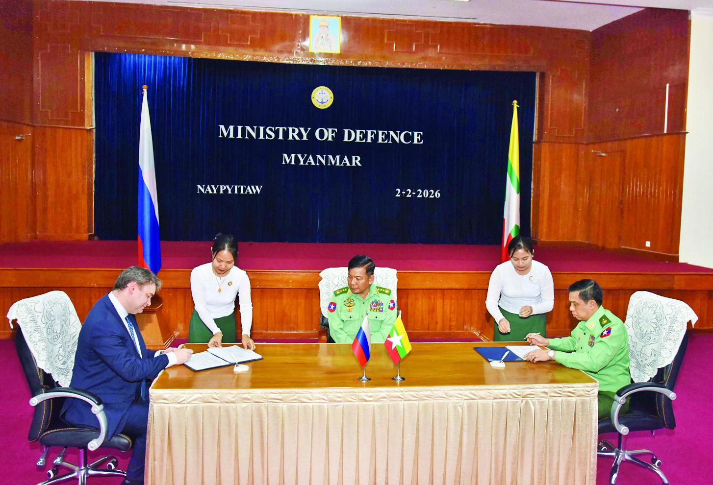 ထို့နောက် ပြည်ထောင်စုဝန်ကြီးရုံး အစည်းအဝေးခန်းမ၌ မြန်မာ-ရုရှားနှစ်နိုင်ငံ ကာကွယ်ရေးဝန်ကြီးဌာနများအကြား စစ်ဘက်ဆိုင်ရာ ပူးပေါင်းဆောင်ရွက်ရေးအစီအစဉ်ကို နှစ်နိုင်ငံ ဒုတိယကာကွယ်ရေးဝန်ကြီးများဖြစ်ကြသည့် ဗိုလ်ချုပ်အောင်မျိုးသန့်နှင့် Mr. Vasilii Sergeevich Osmakovတို့က လက်မှတ်ရေးထိုးကြသည်။