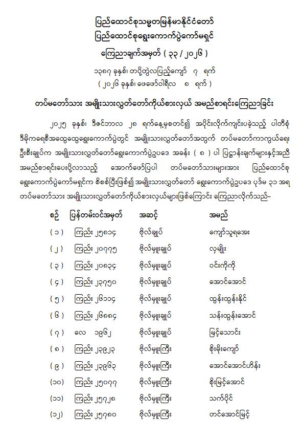 တပ်မတော်သား အမျိုးသားလွှတ်တော်ကိုယ်စားလှယ် အမည်စာရင်းကြေညာခြင်း
