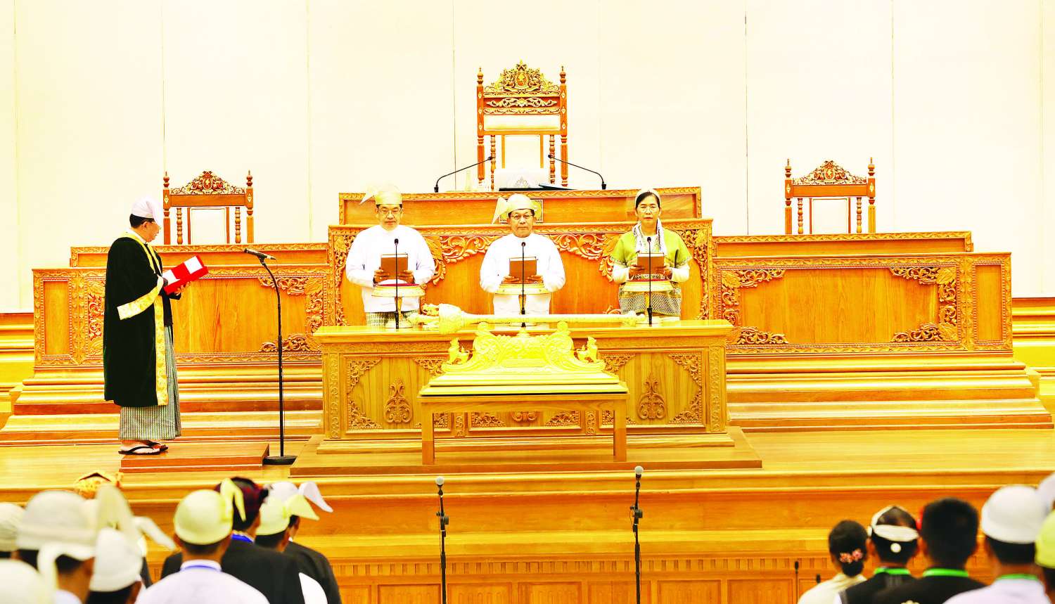 နိုင်ငံတော်သမ္မတအဖြစ် ရွေးချယ်တင်မြှောက်ခံထားရသူ ဦးမင်းအောင်လှိုင်၊ ဒုတိယသမ္မတအဖြစ် ရွေးချယ်တင်မြှောက်ခံထားရသူများဖြစ်သည့် ဦးညိုစောနှင့် ဒေါ်နန်းနီနီအေးတို့ ပြည်ထောင်စုလွှတ်တော်နာယက၏ ရှေ့မှောက်၌ ကတိသစ္စာပြု