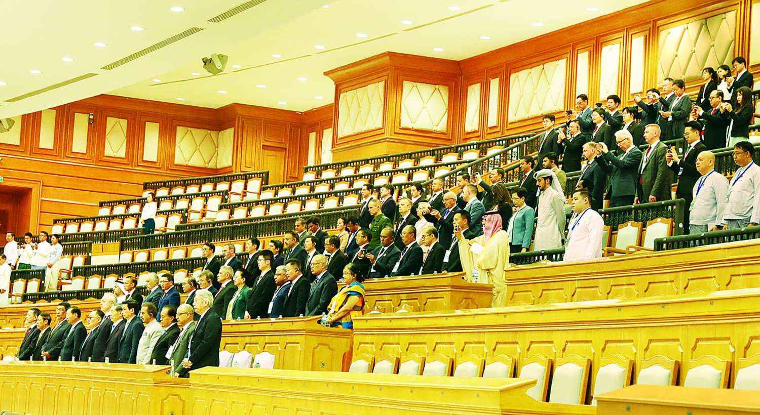ယနေ့ကျင်းပသည့် ပြည်ထောင်စုလွှတ်တော်အစည်းအဝေးသို့ အထူးဧည့်သည်တော်များအဖြစ် တပ်မတော်ကာကွယ်ရေးဦးစီးချုပ် ဗိုလ်ချုပ်ကြီး ရဲဝင်းဦး၊ ဒုတိယတပ်မတော်ကာကွယ်ရေးဦးစီးချုပ်၊ ကာကွယ်ရေးဦးစီးချုပ် (ကြည်း) ဗိုလ်ချုပ်ကြီး ကျော်စွာလင်း၊ တရုတ်ပြည်သူ့သမ္မတနိုင်ငံသမ္မတ၏ အထူးကိုယ်စားလှယ်၊ တရုတ်ပြည်သူ့နိုင်ငံရေးအတိုင်ပင်ခံ ကွန်ဖရင့် ဒုတိယဥက္ကဋ္ဌ H.E. Mr. Jiang Xinzhi ၊ ဘယ်လာရုစ်အောက်လွှတ်တော်ဥက္ကဋ္ဌ H.E. Mr. Igor Sergeyenko ၊ ရုရှားဖက်ဒရေးရှင်းနိုင်ငံ ဒူးမားအောက်လွှတ်တော် ဒုတိယဥက္ကဋ္ဌ H.E. Mr. Sholban Kara-ool ၊ ကမ္ဘောဒီးယားတော်ဝင်အစိုးရ၏ အာဆီယံဆိုင်ရာ အထူးကိုယ်စားလှယ် H.E. Kitti Settha Pandita Cham Prasidh ၊ ထိုင်းနိုင်ငံ ယခင် ဒုတိယဝန်ကြီးချုပ်နှင့် နိုင်ငံခြားရေးဝန်ကြီး H.E. Dr. Parnpree Bahiddha – Nukara တို့အပါအဝင် နိုင်ငံပေါင်း ၂၃ နိုင်ငံမှ သံအမတ်ကြီး ၁၆ ဦးနှင့် သံတမန်များ၊ ပြည်တွင်း/ပြည်ပအဖွဲ့အစည်းများမှ ကိုယ်စားလှယ်များ တက်ရောက်လေ့လာကြသည်။