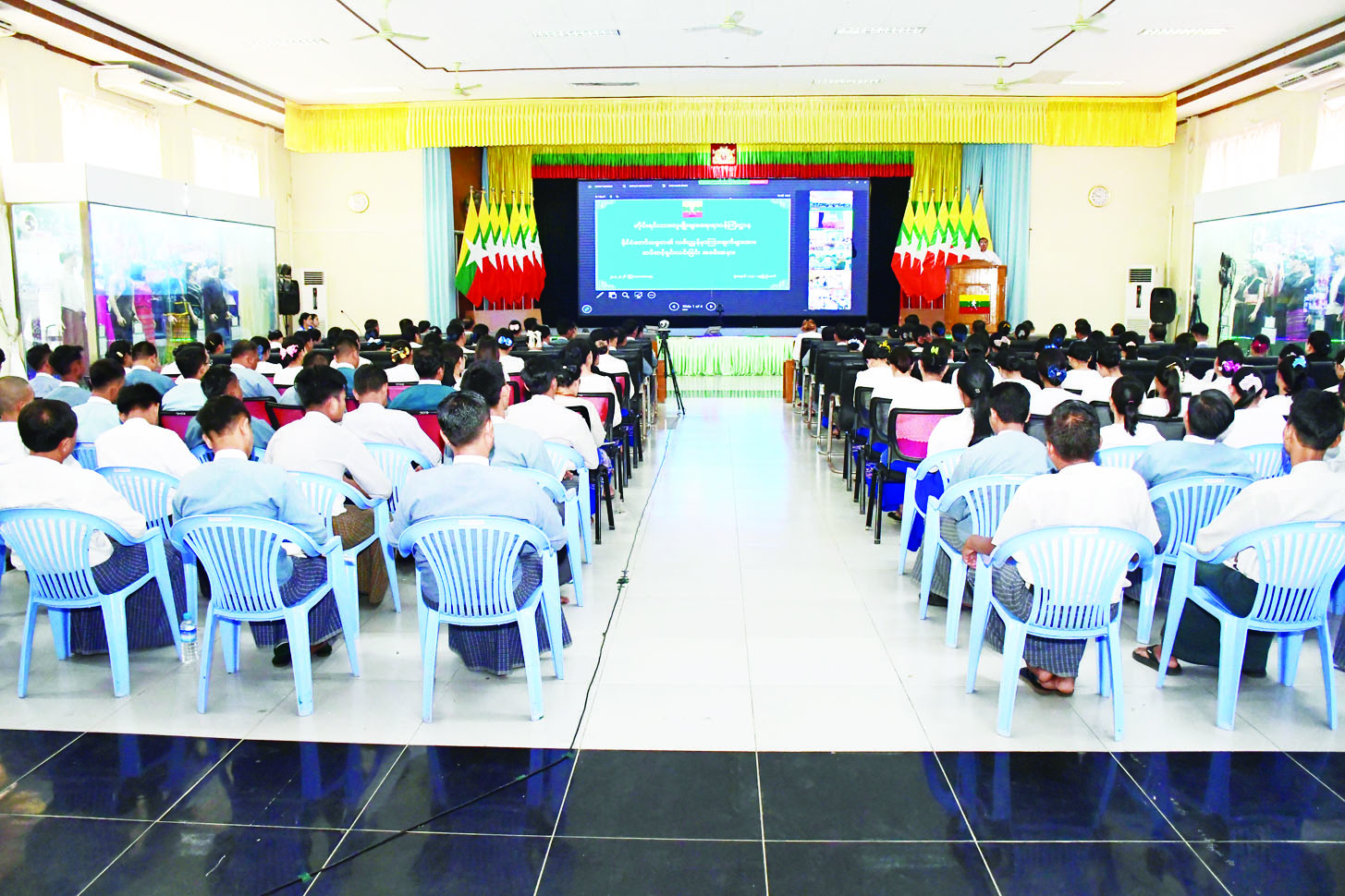 နိုင်ငံတော်သမ္မတ၏ လမ်းညွှန်မှာကြားချက်တွင် နိုင်ငံတော်တည်ငြိမ်အေးချမ်းရေးနှင့် နိုင်ငံတော်ဖွံ့ဖြိုး တိုးတက်ရေးတို့အတွက် အဓိကထားမှာကြားပါကြောင်း၊ နိုင်ငံတော်တည်ငြိမ်အေးချမ်းရေးနှင့် ဖွံ့ဖြိုးတိုးတက်ရေးသည် အပြန်အလှန်အမှီသဟဲပြုနေပါကြောင်း၊ ဝန်ထမ်းများအနေဖြင့် တိုင်းရင်းသားလူမျိုးများ ဖွံ့ဖြိုးတိုးတက်ရေးအတွက် ယခင်ကထက် ပိုမိုအားသွန်ခွန်စိုက် ကြိုးပမ်းပြီးလာမည့်ရက်(၁၀၀)အတွင်း ထိရောက်သည့်အောင်မြင်မှုရရှိစေရန် ဆောင်ရွက်ကြရမည်ဖြစ်ပါကြောင်း၊ ဝန်ထမ်းများ အားလုံးအရည်အချင်းပြည့်ဝစွာဖြင့် စိန်ခေါ်မှုများကို ပူးပေါင်းဆောင်ရွက်ပြီး တစ်ဦးချင်းကောင်းမှ အဖွဲ့အစည်းကောင်းမည်ဖြစ်၍ အဖွဲ့အစည်းကောင်းမှ နိုင်ငံတော်ဖွံ့ဖြိုးတိုးတက်မည် ဖြစ်ပါကြောင်း၊ ဝန်ထမ်းများအနေဖြင့် မိမိတို့ဌာန၏ ဥပဒေ၊ နည်း ဥပဒေများကိုလည်း ကျေကျေညက်ညက် လေ့လာပြီး နိုင်ငံ့ဝန်ထမ်းဥပဒေ၊ နည်းဥပဒေများနှင့်အညီ ဆောင်ရွက်ကြရန်နှင့် မိမိတို့၏ ရာထူးအဆင့်နှင့် လျော်ညီစွာ အရည်အသွေးပြည့်ဝပြီး စွမ်းဆောင်ရည် မြင့်မားရေးအတွက် စဉ်ဆက်မပြတ် ကြိုးစားနေကြရမည်ဖြစ်ပါကြောင်း၊ ဝန်ကြီးဌာန၏ မျှော်မှန်းချက်၊ ရည်မှန်းချက်နှင့် လုပ်ငန်းတာဝန်များ အောင်မြင်စေရေးအတွက် ဝန်ထမ်းများအားလုံး တက်ညီလက်ညီ ဝိုင်းဝန်းဆောင်ရွက်သွားကြရန် တိုက်တွန်းပြောကြားသည်။
