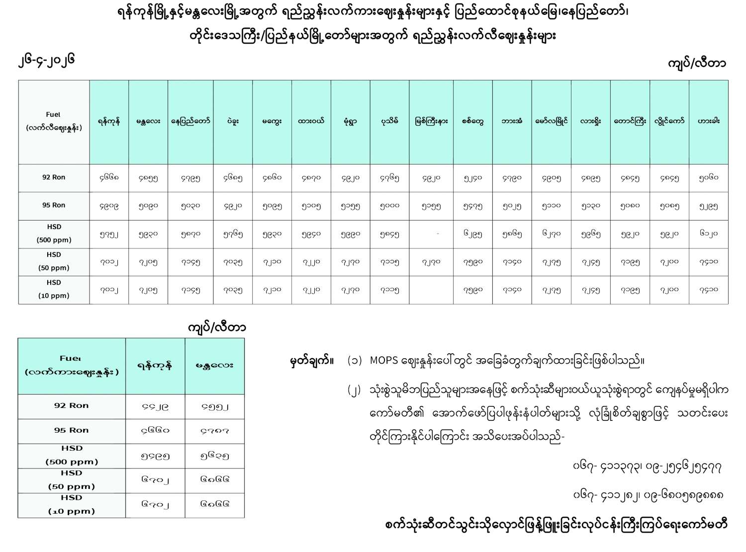 ရန်ကုန်မြို့နှင့် မန္တလေးမြို့အတွက် ရည်ညွှန်းလက်ကားဈေးနှုန်းများနှင့် ပြည်ထောင်စုနယ်မြေ နေပြည်တော်၊ တိုင်းဒေသကြီး/ပြည်နယ် မြို့တော်များအတွက် ရည်ညွှန်းလက်လီဈေးနှုန်းများ 04/26/2026