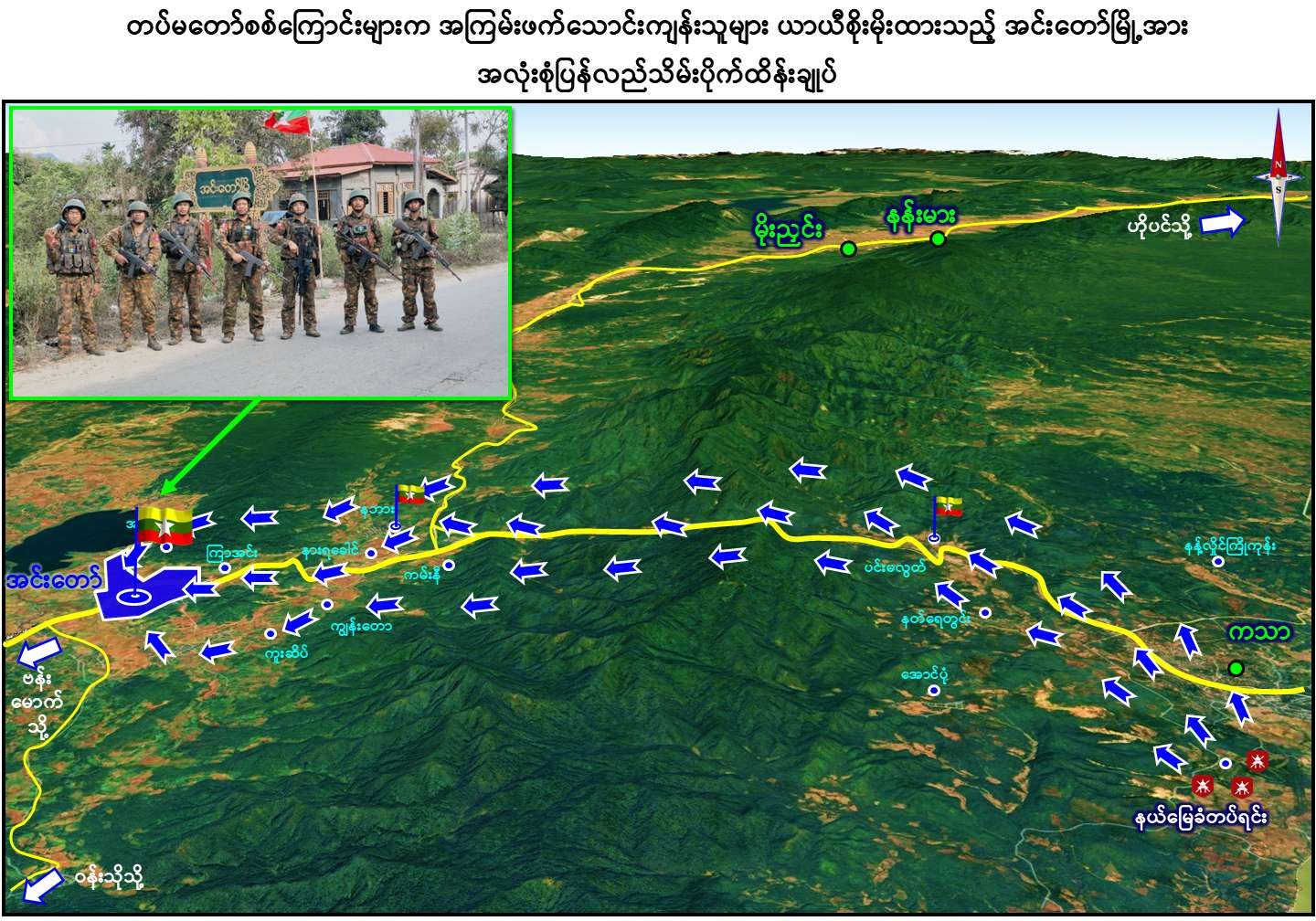 တပ်မတော်စစ်ကြောင်းများက အကြမ်းဖက်သောင်းကျန်းသူများ ယာယီစိုးမိုးထားသော အင်းတော်မြို့နှင့် အဆိုပါဒေသတစ်ဝိုက်အား ယနေ့တွင် အလုံးစုံပြန်လည်သိမ်းပိုက်ထိန်းချုပ်နိုင်ခဲ့သည်။
