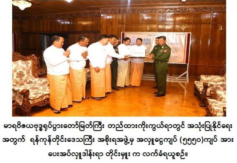 မာရဝိဇယရုပ်ပွားတော်မြတ်ကြီး တည်ထားကိုးကွယ်ရာတွင် အသုံးပြုနိုင်ရေးအတွက် စေတနာရှင်အလှူရှင်များက အလှူငွေများလှူဒါန်းခြင်းကို ယနေ့နံနက်ပိုင်းတွင် ရန်ကုန်တိုင်းဒေသကြီး၊ ဒဂုံမြို့နယ်ရှိ တိုင်းဒေသကြီး အစိုးရအဖွဲ့ရုံး မင်္ဂလာခန်းမ၌ ပြုလုပ်ရာ တိုင်းဒေသကြီးဝန်ကြီးချုပ် ဦးစိုးသိန်း၊ ရန်ကုန်တိုင်းစစ်ဌာနချုပ် တိုင်းမှူး ဗိုလ်ချုပ် ညွန့်ဝင်းဆွေနှင့် တာဝန်ရှိသူများ၊ စေတနာရှင်အလှူရှင်များ တက်ရောက်ကြသည်။
