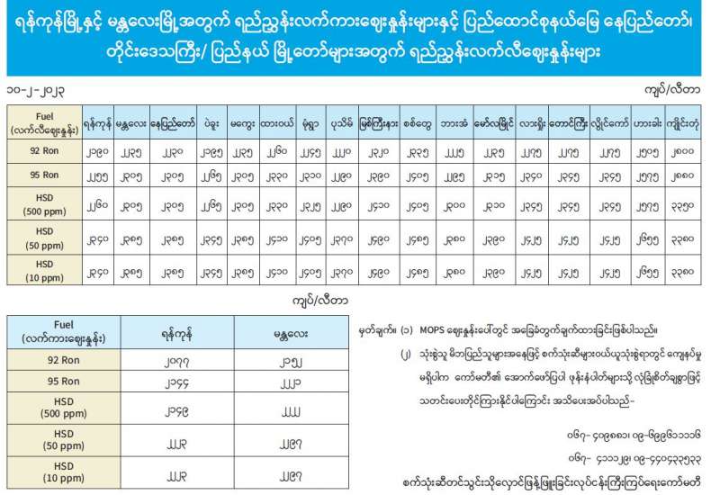 ရန်ကုန်မြို့နှင် မန္တလေးမြို့အတွက် ရည်ညွှန်းလက်ကားဈေးနှုန်းများနှင့် ပြည်ထောင်စုနယ်မြေ နေပြည်တော်၊ တိုင်းဒေသကြီး/ပြည်နယ် မြို့တော်များအတွက် ရည်ညွှန်းလက်လီဈေးနှုန်းများ