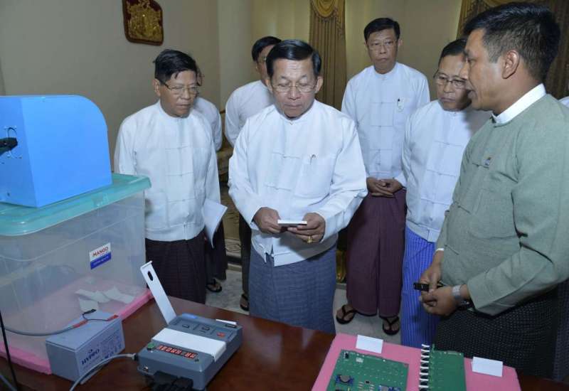 နိုင်ငံတော်စီမံအုပ်ချုပ်ရေးကောင်စီဥက္ကဋ္ဌ နိုင်ငံတော်ဝန်ကြီးချုပ် ဗိုလ်ချုပ်မှူးကြီးမင်းအောင်လှိုင်ထံ ပြည်ထောင်စုရွေးကောက်ပွဲကော်မရှင်မှ Myanmar Electronic Voting Maching (MEVM) တည်ဆောက်ထားရှိမှုနှင့်ပတ်သက်၍ ရှင်းလင်းတင်ပြခြင်းကို ယနေ့ညနေပိုင်းတွင် နေပြည်တော်ရှိ နိုင်ငံတော်စီမံအုပ်ချုပ်ရေးကောင်စီဥက္ကဋ္ဌရုံး အစည်းအဝေးခန်းမ၌ပြုလုပ်ရာ နိုင်ငံတော်စီမံအုပ်ချုပ်ရေးကောင်စီဒုတိယဥက္ကဋ္ဌ ဒုတိယဝန်ကြီးချုပ် ဒုတိယဗိုလ်ချုပ်မှူးကြီးစိုးဝင်း၊ ကောင်စီအတွင်းရေးမှူး ဒုတိယဗိုလ်ချုပ်ကြီးအောင်လင်းဒွေး၊ တွဲဖက်အတွင်းရေးမှူး ဒုတိယဗိုလ်ချုပ်ကြီးရဲဝင်းဦး၊ ကောင်စီဝင်များဖြစ်ကြသည့် ဗိုလ်ချုပ်ကြီးမြထွန်းဦး၊ ဗိုလ်ချုပ်ကြီးတင်အောင်စန်း၊ ဒုတိယဗိုလ်ချုပ်ကြီးစိုးထွဋ်၊ ပြည်ထောင်စုရွေးကောက်ပွဲကော်မရှင်ဥက္ကဋ္ဌ ဦးသိန်းစိုးနှင့် တာဝန်ရှိသူများ တက်ရောက်ကြသည်။