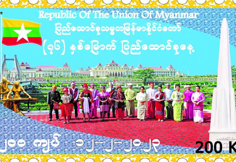 ပို့ဆောင်ရေးနှင့်ဆက်သွယ်ရေးဝန်ကြီးဌာန မြန်မာ့စာတိုက်လုပ်ငန်းမှ ဖေဖော်ဝါရီ ၁၂ ရက်တွင်ကျရောက်မည့် (၇၆)နှစ်မြောက် ပြည်ထောင်စုနေ့ကိုဂုဏ်ပြုသောအားဖြင့် (၂၀၀ ကျပ်တန်) အထူးထုတ် စာပို့တံဆိပ်ခေါင်းသစ်တစ်မျိုးကို ၂၀၂၃ ခုနှစ် ဖေဖော်ဝါရီ ၁၂ ရက် မြန်မာသက္ကရာဇ် ၁၃၈၄ ခုနှစ် တပို့တွဲလဆုတ် ၈ ရက် (တနင်္ဂနွေနေ့) နံနက် ၉ နာရီခွဲမှစတင်၍ နေပြည်တော်ဗဟိုစာတိုက်ကြီး၊ ရန်ကုန်စာတိုက်ကြီး၊ မန္တလေးစာတိုက်ကြီးတို့နှင့် တိုင်းဒေသကြီး/ပြည်နယ်များရှိ စာတိုက်ကြီးများတွင် ရောင်းချပေးသွားမည်ဖြစ်သည်။