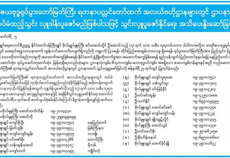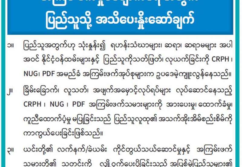 အကြမ်းဖက်အုပ်စုအဖြစ်ကြေညာထားသော CRPH၊ NUG နှင့် ယင်းတို့၏လက်အောက်ခံ အဖွဲ့အစည်းများ၊ ယင်းတို့နှင့်ဆက်နွှယ်နေသော အဖွဲ့အစည်းများ၊ လူပုဂ္ဂိုလ်များသည် နိုင်ငံတော် တည်ငြိမ်အေးချမ်းရေးကို ပျက်ပြားစေရန်နှင့် ပြည်သူလူထုကို အကြောက်တရားများ ဖြစ်ပေါ်စေပြီး အစိုးရယန္တရားများ ပျက်ပြားစေရန်ရည်ရွယ်လျက် လှုံ့ဆော်ခြင်း၊ ဝါဒဖြန့်ခြင်း၊ ခြိမ်းခြောက်ခြင်းများကို လူမှုကွန်ရက်များမှတစ်ဆင့် နည်းမျိုးစုံဖြင့် ပြုလုပ်လျက်ရှိပါသည်။