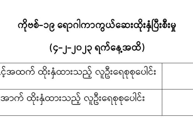 ကျန်းမာရေးဝန်ကြီးဌာနသည် COVID-19 သံသယလူနာများ၊ ဓာတ်ခွဲအတည်ပြုလူနာနှင့် အနီးကပ်ထိတွေ့ခဲ့သူများနှင့် အသွားအလာကန့်သတ်ထားရှိသူများအား COVID-19 ရောဂါ ရှိ၊ မရှိ ဓာတ်ခွဲစစ်ဆေးခြင်း ပုံမှန်ဆောင်ရွက်လျက်ရှိပြီး (၅-၂-၂၀၂၃) ရက်နေ့၊ ည (၈:၀၀) နာရီမှ (၆-၂-၂၀၂၃) ရက်နေ့၊ ည(၈:၀၀)နာရီအတွင်း ဓာတ်ခွဲနမူနာစုစုပေါင်း (၃,၂၈၂) ခုအား စစ်ဆေးပြီးစီးခဲ့ရာ COVID-19 ရောဂါ ဓာတ်ခွဲအတည်ပြုလူနာသစ်မတွေ့ရှိရသဖြင့် ရောဂါပိုးတွေ့ရှိမှုရာခိုင်နှုန်းမှာ (၀) ရာခိုင်နှုန်းရှိပါသည်။