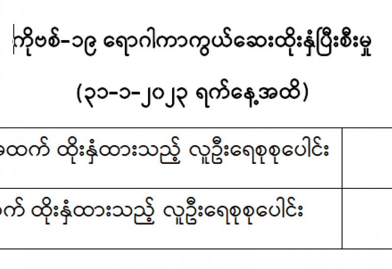 ကျန်းမာရေးဝန်ကြီးဌာနသည် COVID-19 သံသယလူနာများ၊ ဓာတ်ခွဲအတည်ပြုလူနာနှင့် အနီးကပ်ထိတွေ့ခဲ့သူများနှင့် အသွားအလာကန့်သတ်ထားရှိသူများအား COVID-19 ရောဂါ ရှိ၊ မရှိ ဓာတ်ခွဲစစ်ဆေးခြင်း ပုံမှန်ဆောင်ရွက်လျက်ရှိပြီး (၃၁-၁-၂၀၂၃) ရက်နေ့၊ ည (၈:၀၀) နာရီမှ (၁-၂-၂၀၂၃) ရက်နေ့၊ ည (၈:၀၀) နာရီအတွင်း ဓာတ်ခွဲနမူနာစုစုပေါင်း (၃,၄၀၉) ခုအား စစ်ဆေးပြီးစီးခဲ့ရာ COVID-19 ရောဂါ ဓာတ်ခွဲအတည်ပြုလူနာသစ် (၁၃) ဦး တွေ့ရှိရသဖြင့် ရောဂါပိုးတွေ့ရှိမှု ရာခိုင်နှုန်း မှာ (၀.၃၈) ရာခိုင်နှုန်းရှိပါသည်။