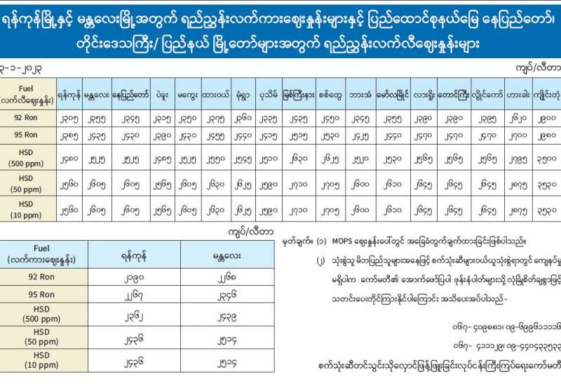 ရန်ကုန်မြို့နှင့် မန္တလေးမြို့အတွက် ရည်ညွှန်းလက်ကားဈေးနှုန်းများနှင့် ပြည်ထောင်စုနယ်မြေ နေပြည်တော်၊ တိုင်းဒေသကြီး/ ပြည်နယ် မြို့တော်များအတွက် ရည်ညွှန်းလက်လီဈေးနှုန်းများ