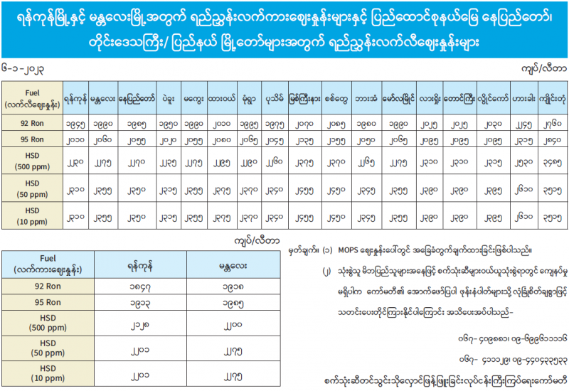 ရန်ကုန်မြို့နှင့် မန္တလေးမြို့အတွက် ရည်ညွှန်းလက်ကားဈေးနှုန်းများနှင့် ပြည်ထောင်စုနယ်မြေ နေပြည်တော်၊ တိုင်းဒေသကြီး/ပြည်နယ် မြို့တော်များအတွက် ရည်ညွှန်းလက်လီဈေးနှုန်းများ