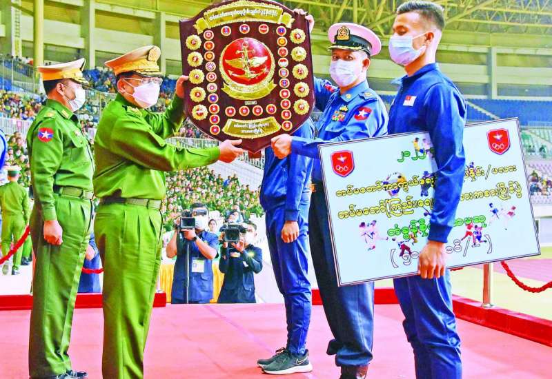 ၂၀၂၂ ခုနှစ်၊ တပ်မတော်(ကြည်း၊ ရေ၊ လေ)အားကစားပြိုင်ပွဲ ဆုချီးမြှင့်ပွဲအခမ်းအနားကို ယနေ့ညနေပိုင်းတွင် နေပြည်တော်ရှိ ဇေယျာသီရိတပ်မတော်အားကစားကွင်း၌ ကျင်းပပြုလုပ်ရာ နိုင်ငံတော်စီမံအုပ်ချုပ်ရေးကောင်စီဥက္ကဋ္ဌ တပ်မတော်ကာကွယ်ရေးဦးစီးချုပ် ဗိုလ်ချုပ်မှူးကြီး မင်းအောင်လှိုင် တက်ရောက်အားပေး၍ ဆုများပေးအပ်ချီးမြှင့်သည်။