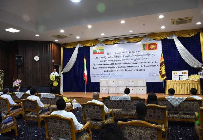 ပြည်ထောင်စုသမ္မတမြန်မာနိုင်ငံတော်အစိုးရမှ သီရိလင်္ကာဒီမိုကရက်တစ် ဆိုရှယ်လစ်သမ္မတနိုင်ငံ အစိုးရသို့ လှူဒါန်းသည်ဆေးနှင့်ဆေးပစ္စည်းများ လွှဲပြောင်းပေးအပ်ခြင်း အခမ်းအနားကို ယနေ့တွင် ရန်ကုန်မြို့၊ ဆေးသုတေသနဦးစီးဌာန၊ အစည်းအဝေးခန်းမ၌ကျင်းပရာ ကျန်းမာရေးဝန်ကြီးဌာန၊ ပြည်ထောင်စုဝန်ကြီး ဒေါက်တာသက်ခိုင်ဝင်း၊ မြန်မာနိုင်ငံဆိုင်ရာ သီရိလင်္ကာ ဒီမိုကရက်တစ် ဆိုရှယ်လစ်သမ္မတနိုင်ငံ သံအမတ်ကြီး H.E Mr. J.M.J.P Bandara၊ ရန်ကုန်တိုင်းဒေသကြီး ဝန်ကြီးချုပ်၊ ဦးစိုးသိန်းနှင့် အစိုးရအဖွဲ့ဝင်များ တက်ရောက်ကြသည်။