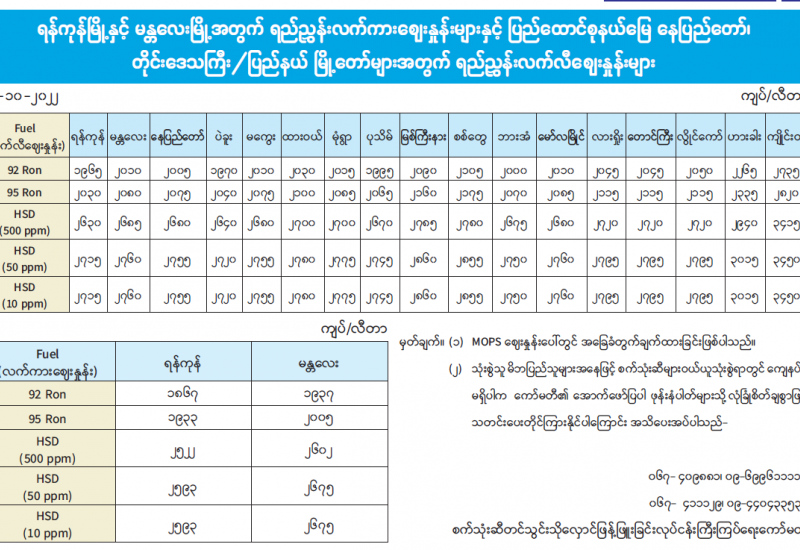 ရန်ကုန်မြို့နှင့် မန္တလေးမြို့အတွက် ရည်ညွှန်းလက်ကား ဈေးနှုန်းများနှင့် ပြည်ထောင်စုနယ်မြေ နေပြည်တော်၊ တိုင်းဒေသကြီး/ ပြည်နယ် မြို့တော်များအတွက် ရည်ညွှန်းလက်လီဈေးနှုန်းများ