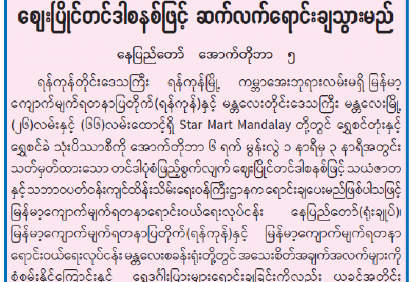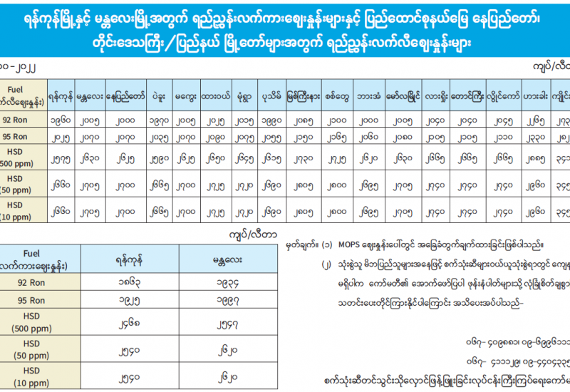 ရန်ကုန်မြို့နှင့် မန္တလေးမြို့အတွက် ရည်ညွှန်းလက်ကား ဈေးနှုန်းများနှင့် ပြည်ထောင်စုနယ်မြေ နေပြည်တော်၊ တိုင်းဒေသကြီး/ပြည်နယ် မြို့တော်များအတွက် ရည်ညွှန်းလက်လီဈေးနှုန်းများ