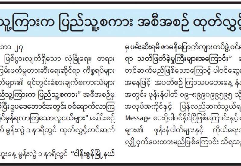“လူကုန်ကူးခံရသူများအား ပြန်လည်လက်ခံရေး၊ ပြန်လည်ဝင်ဆံ့ပေါင်းစည်းရေးနှင့် ပြန်လည်ထူထောင်ရေး လုပ်ငန်းများဆိုင်ရာ အမျိုးသားအဆင့် စံလုပ်ငန်းအစီအစဉ် အသုံးပြုနည်းသင်တန်း” ဖွင့်ပွဲအခမ်းအနားကို ယနေ့နံနက် ၁၀ နာရီတွင် နေပြည်တော်ရှိ လူမှုဝန်ထမ်း၊ ကယ်ဆယ်ရေးနှင့် ပြန်လည် နေရာချထားရေးဝန်ကြီးဌာန၊ စုပေါင်းအစည်း အဝေးခန်း၌ ကျင်းပသည်။