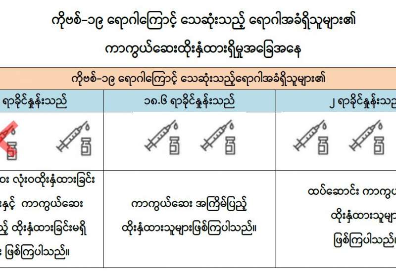 ယခုရက်သတ္တပတ်အတွင်း ကိုဗစ်-၁၉ ရောဂါ အတည်ပြုလူနာများ နေ့စဉ် စိုးရိမ်ဖွယ်ရာတိုးလာသလို ပြန်လည်လျော့ကျသွားသည့် ရက်များလည်းရှိသည်ကို တွေ့ရမည်ဖြစ်သည်။ ဓာတ်ခွဲစစ်ဆေး ရောဂါပိုးတွေ့ရှိသည့် လူနာများတွင် ယခင်ရက်က သေဆုံးရသည့် လူနာအချို့သည် ကာကွယ်ဆေးမထိုးထားခြင်း၊ ရောဂါအခံများရှိနေခြင်းတို့ကြောင့်ဟု သိရသည်။ ထို့ကြောင့် ပြည်သူများအနေဖြင့် ကာကွယ်ဆေးကို အကြိမ်ပြည့်ထိုးနှံပြီး ထပ်ဆောင်းကာကွယ်ဆေးများပါ ထိုးထားရန်လိုပါသည်။ ထို့အပြင် ရောဂါအခံများရှိနေပါက ကိုဗစ်-၁၉ ရောဂါ ကူးစက်ခံရခြင်းမရှိအောင် အထူးဂရုစိုက်နေထိုင်ကြရန် လိုအပ်ပါသည်။
