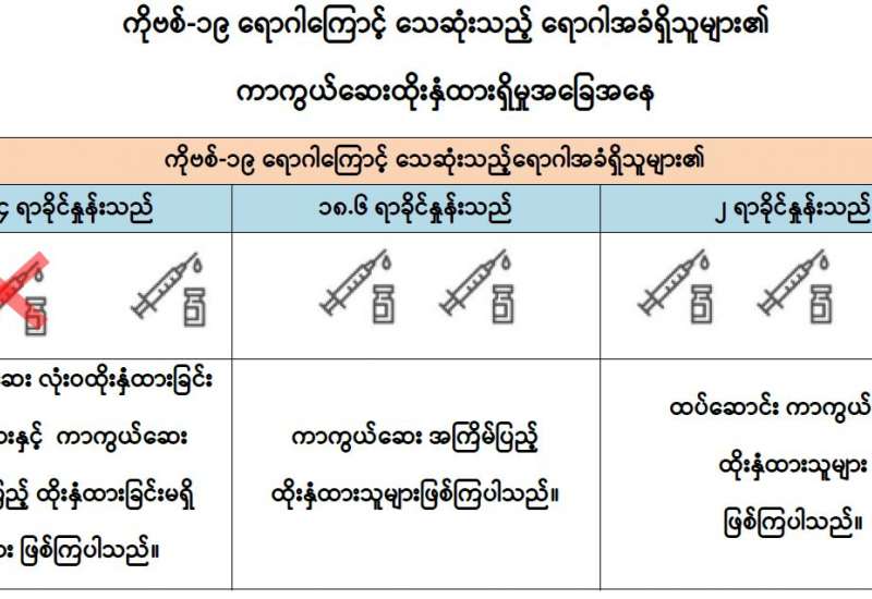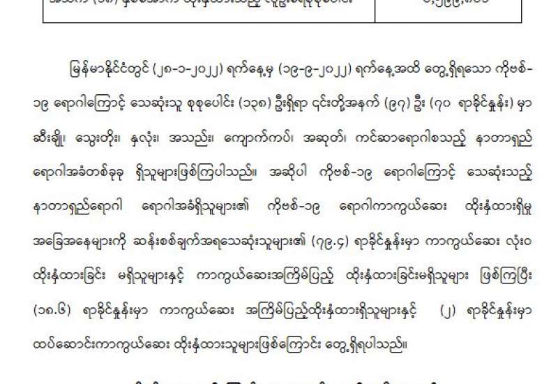 ကျန်းမာရေးဝန်ကြီးဌာနအနေဖြင့် နိုင်ငံအတွင်းကူးစက်ဖြစ်ပွားနေသော COVID-19 ရောဂါ ကာကွယ်၊ ကုသ၊ ထိန်းချုပ်ရေးလုပ်ငန်းများကို အရှိန်အဟုန်မပြတ် ဆောင်ရွက်လျက်ရှိရာ ရောဂါထိန်းချုပ်ရေးလုပ်ငန်းများ အောင်မြင်နိုင်ရေးအတွက် ပြည်သူလူထုအနေဖြင့် ကျန်းမာရေးဝန်ကြီးဌာနမှ ထုတ်ပြန်ထားသော COVID-19 ရောဂါကာကွယ်ထိန်းချုပ်ရေးဆိုင်ရာ စည်းကမ်းများကို စနစ်တကျလိုက်နာဆောင်ရွက်ရန်လိုအပ်ပြီး COVID-19 ကာကွယ်ဆေးထိုးနှံမှုခံယူခြင်းအား အထူးဂရုပြု ပူးပေါင်းဆောင်ရွက်ကြရန် လိုအပ်ပါသည်။