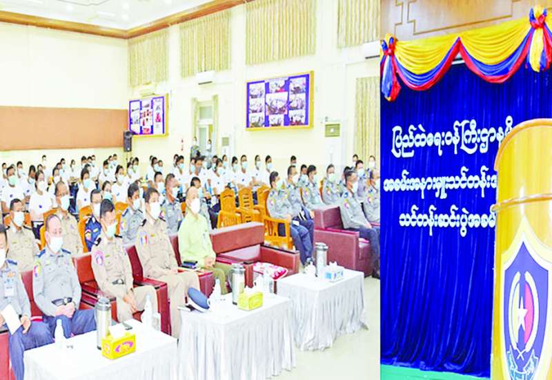 ပြည်ထဲရေးဝန်ကြီးဌာနက ကြီးမှူး ဖွင့်လှစ်သည့် အခမ်းအနားမှူး သင်တန်း၊ အစားအသောက်နှင့် အဖျော်ယမကာဝန်ဆောင်မှု ကျွမ်းကျင်သင်တန်းများ သင်တန်းဆင်းပွဲ အခမ်းအနားကို ယနေ့နံနက်ပိုင်းတွင် နေပြည်တော် ရုံးအမှတ်(၈) အရိန္ဒမာခန်းမ၌ ကျင်းပရာ အခမ်းအနားမှူး သင်တန်းကို ပြည်ထဲရေးဝန်ကြီးဌာန ဒုတိယဝန်ကြီး ဗိုလ်ချုပ်စိုးတင့်နိုင်နှင့် အစားအသောက် နှင့် အဖျော်ယမကာဝန်ဆောင်မှု ကျွမ်းကျင်သင်တန်းကို ပြည်ထဲရေးဝန်ကြီးဌာန ဒုတိယဝန်ကြီး မြန်မာနိုင်ငံ ရဲတပ်ဖွဲ့ရဲချုပ် ဗိုလ်ချုပ်ဇင်မင်းထက်တို့ တက်ရောက်၍ သင်တန်းဆင်းအမှာ စကားပြောကြားကာ သင်တန်း ဆင်းလက်မှတ်များ ပေးအပ်ကြသည်။
