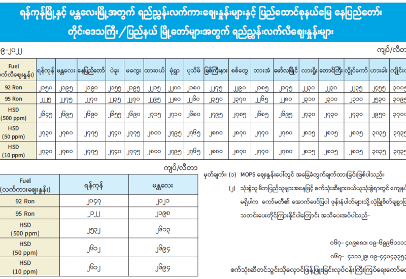ရန်ကုန်မြို့နှင့် မန္တလေးမြို့အတွက် ရည်ညွှန်းလက်ကား ဈေးနှုန်းများနှင့် ပြည်ထောင်စုနယ်မြေ နေပြည်တော်၊ တိုင်းဒေသကြီး/ပြည်နယ် မြို့တော်များအတွက် ရည်ညွှန်းလက်လီဈေးနှုန်းများ