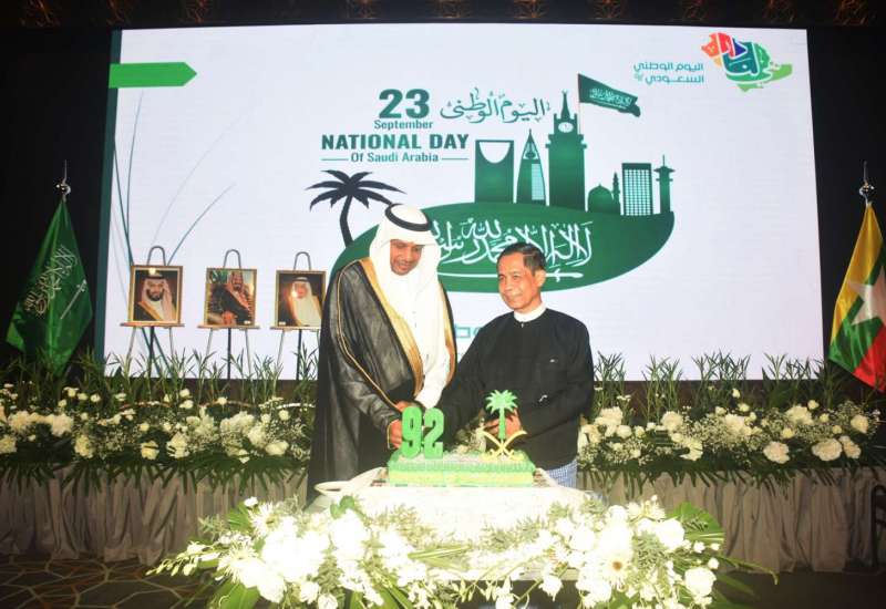ဆော်ဒီအာရေဗျနိုင်ငံ၏ (၉၂)နှစ်မြောက် အမျိုးသားနေ့ အထိမ်းအမှတ် ဧည့်ခံပွဲအခမ်းအနားကို ယနေ့ညနေ ၆ နာရီတွင် ရန်ကုန်မြို့ Wyndham Grand Yangon Hotel ၌ကျင်းပရာ အပြည်ပြည်ဆိုင်ရာ ပူးပေါင်းဆောင်ရွက်ရေးဝန်ကြီးဌာန ပြည်ထောင်စုဝန်ကြီး ဦးကိုကိုလှိုင် တက်ရောက်သည်၊၊